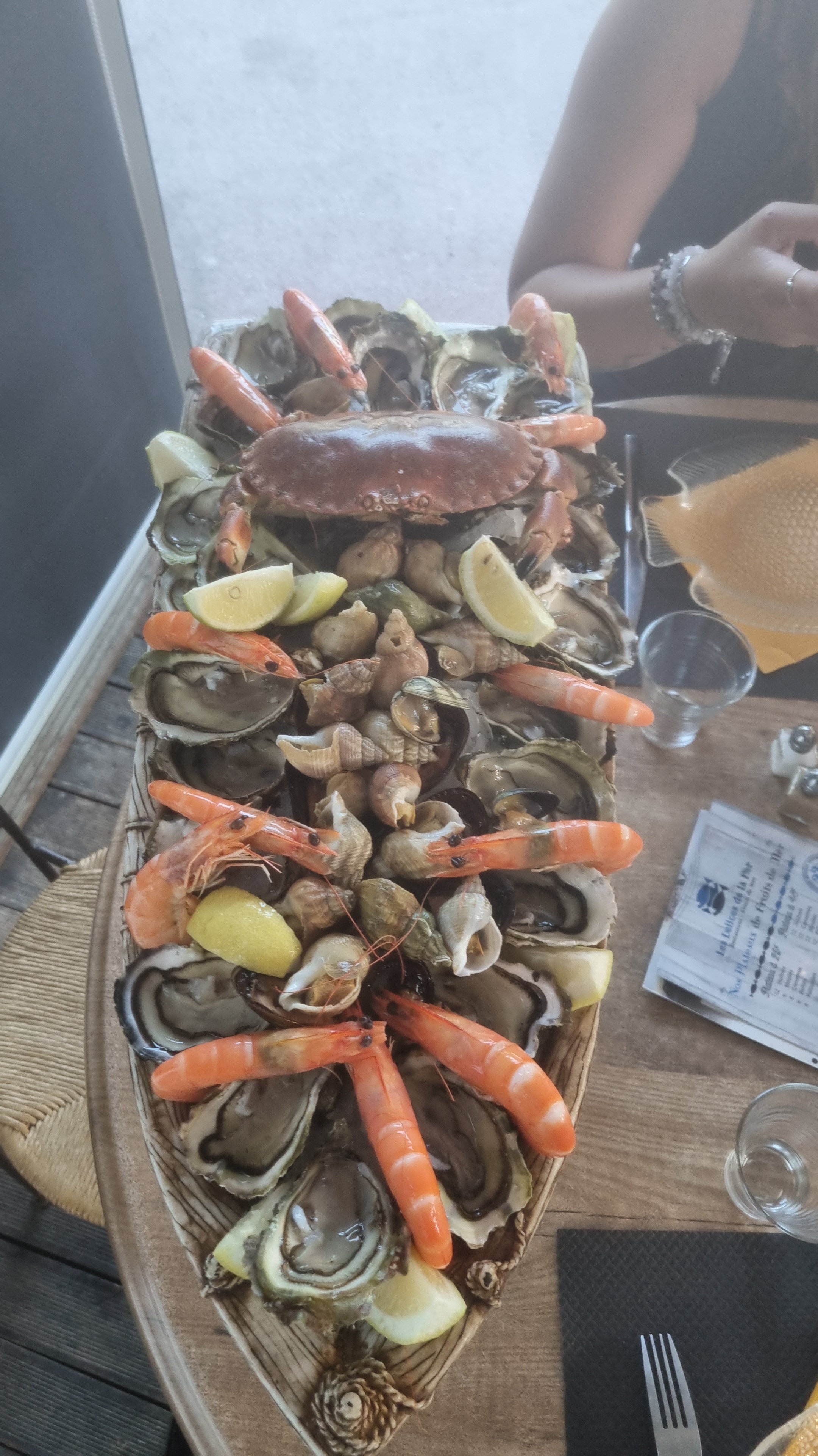 Posté le 14/08/2023 à 07:44"Merci pour ce beau plateau de fruit de mer pour 5 qui était super bien présenté et de vos conseils..(on a tous mangé).fruit de la mer extrêmement frais accompagné de son aïoli, citron vert et vinaigre pour les huitres.Petit resto ou de l'extérieur on peut pas deviner quel régal on peut trouver à l'intérieur. .je vous conseil de réserver car pas beaucoup de place et il y a du monde.."