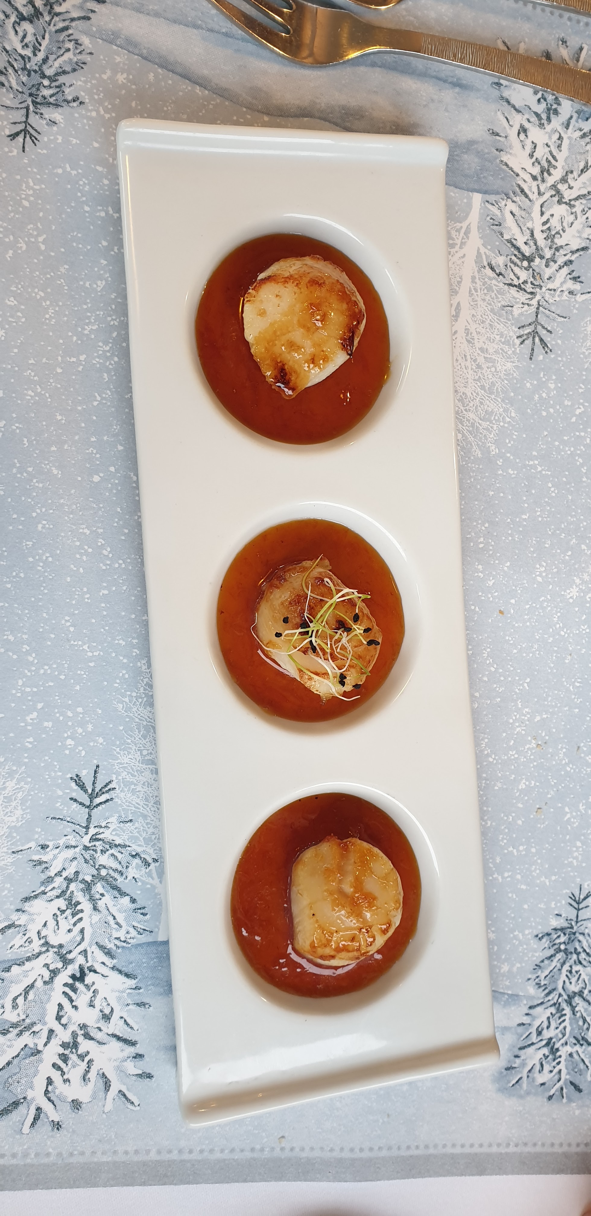 Entrée >>2 petites !!! langoustines pour 22€ sur une purée (fade)de carottes qui semblait être là pour remplirune assiette maigrichonne Plat>>5st Jacques avec légumes mal cuits 38 € Moralité : déçu et payé bcp trop cher pour ce qui m'a été proposé alors que je me faisais une joie de me rendre chez vous...