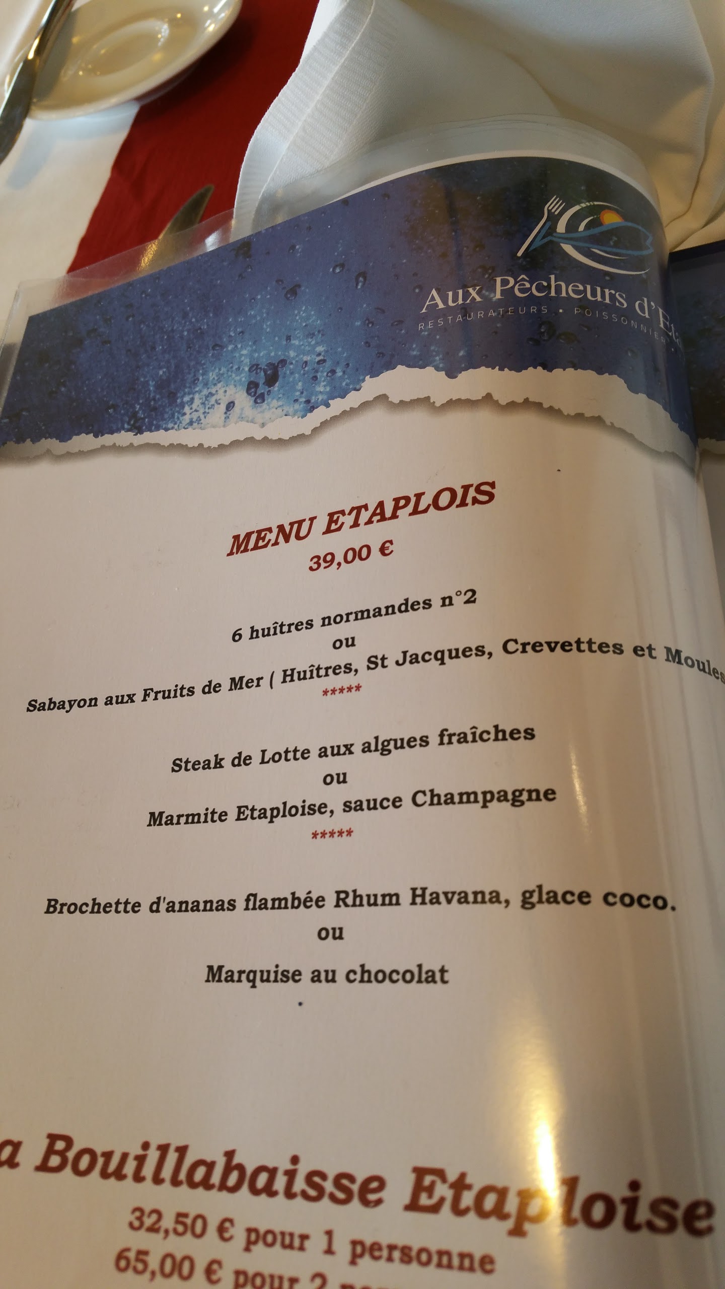 Posté le 30/04/2019 à 09:41"Je mets une note contrastée pour ce restaurant : à la carte c'est bon, les coquilles Saint-Jacques au risotto étaient délicieuses, mais le menu *bouillabaisse d'Étaples* par contre je le déconseille. J'ai eu une soupe de poisson déguisée difficilement en bisque de homard et une espèce de bouillabaisse où seule la langoustine était de qualité. Le reste était sans goût, ce qui est un comble pour une bouillabaisse. J'ai été déçu."