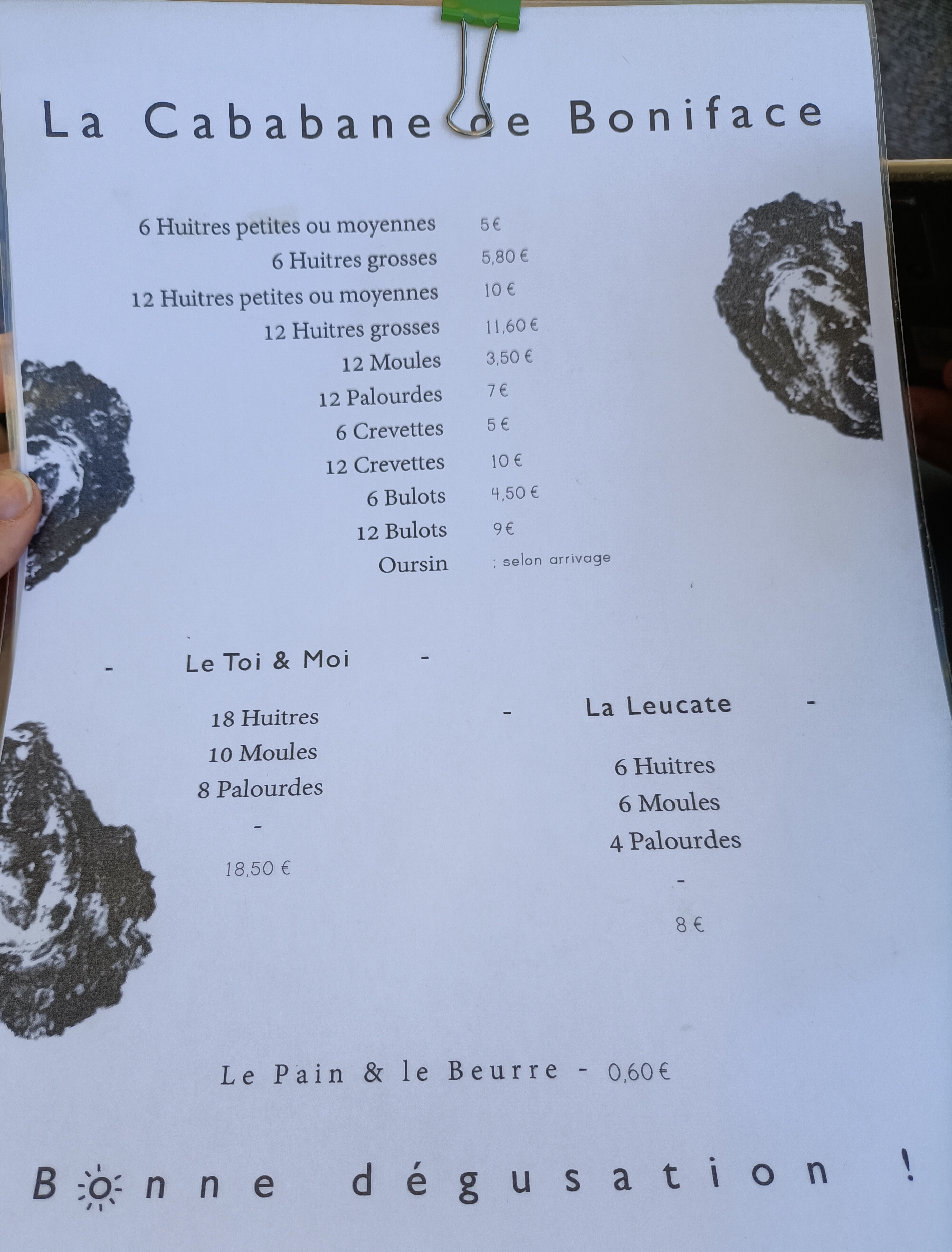 plateau fruits de mer toi et moi 24 euros rejout à la demande crevettes boulots 6 euros ou oursins 3 euros bon qualité prix
