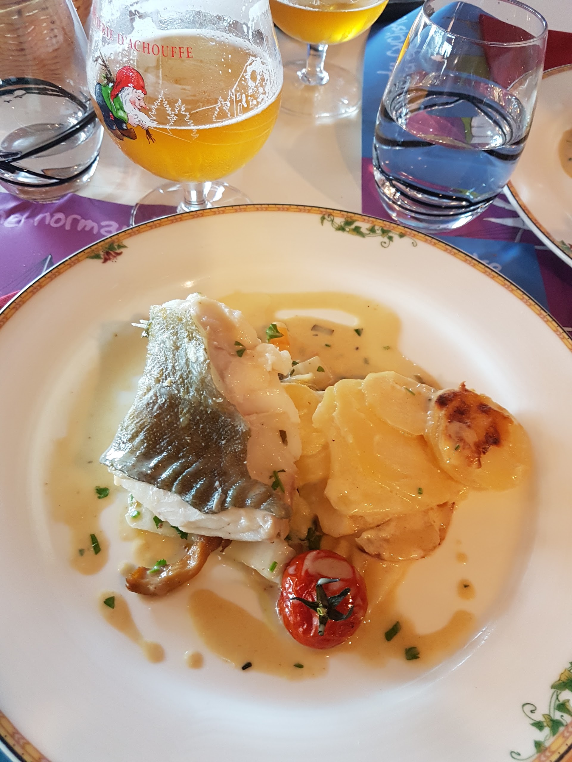 Posté le 30/07/2023 à 17:51"L’un des plus merveilleux que j’ai fais ces dernières années. Le restaurant était complet je n’avais pas réservé, j’étais en vélo de route (donc avec la tenue officiellement ridicule du cycliste: cuissard court et chaussures pour pédales automatiques au pied qui nous donnent une démarche de manchots) trempé de la tête aux pieds mais finalement la serveuse via le patron a réussi à me dénicher une petite place. En entrée le duo crevettes/bigorneau fait très bien le job -même si j’aurais aimé deux crevettes et deux bigornaux de plus je l’avoue. Les produits sont frais, la mayo est parfaite. Suit un bar grillé et ses petits légumes. La sauce est délicieuse, le bar est bien cuit et le petit goût de fenouil est équilibré pour ne pas prendre tout le palais. C’est savoureux et copieux comme il faut. Je me suis même laissé aller à une spécialité normande (c’est dans le menu) le Teurgoule (riz au lait cuit de longues heures) avec sa touche de rhubarbe caramélisée -je crois que c’était de la rhubarbe. Avec un verre de blanc sec, correct. Toujours est-il que j’ai passé un très très bon moment. Le menu à 36€ n’est pas donné mais je pars du principe suivant: je préfère de loin payer 36€ pour un délicieux repas que 10€ de moins pour un banal voire médiocre repas. Et cela arrive malheureusement plus souvent que le contraire. Je recommande ce restaurant pour son cadre, sa simplicité et surtout sa merveilleuse cuisine. Lionel"