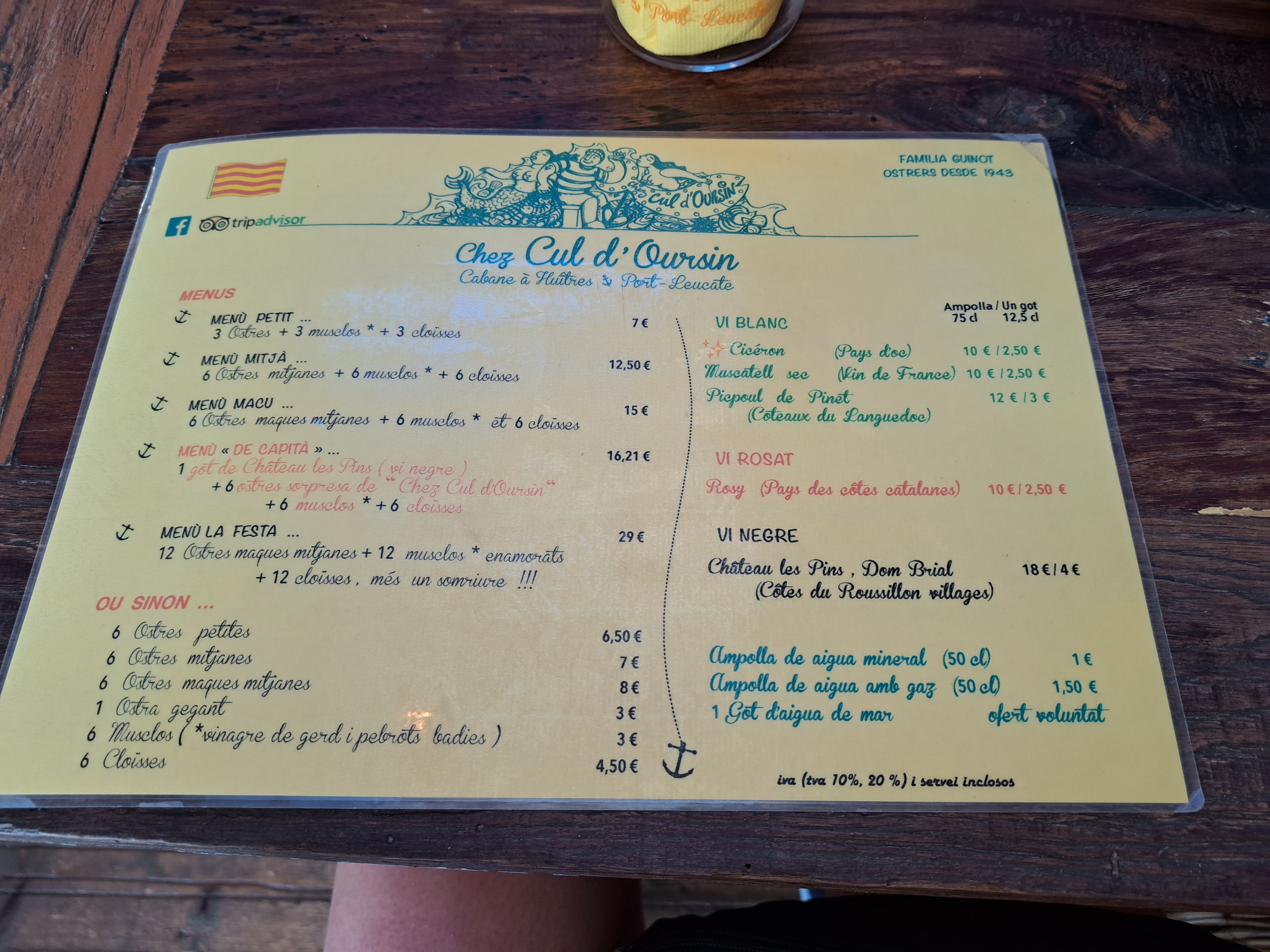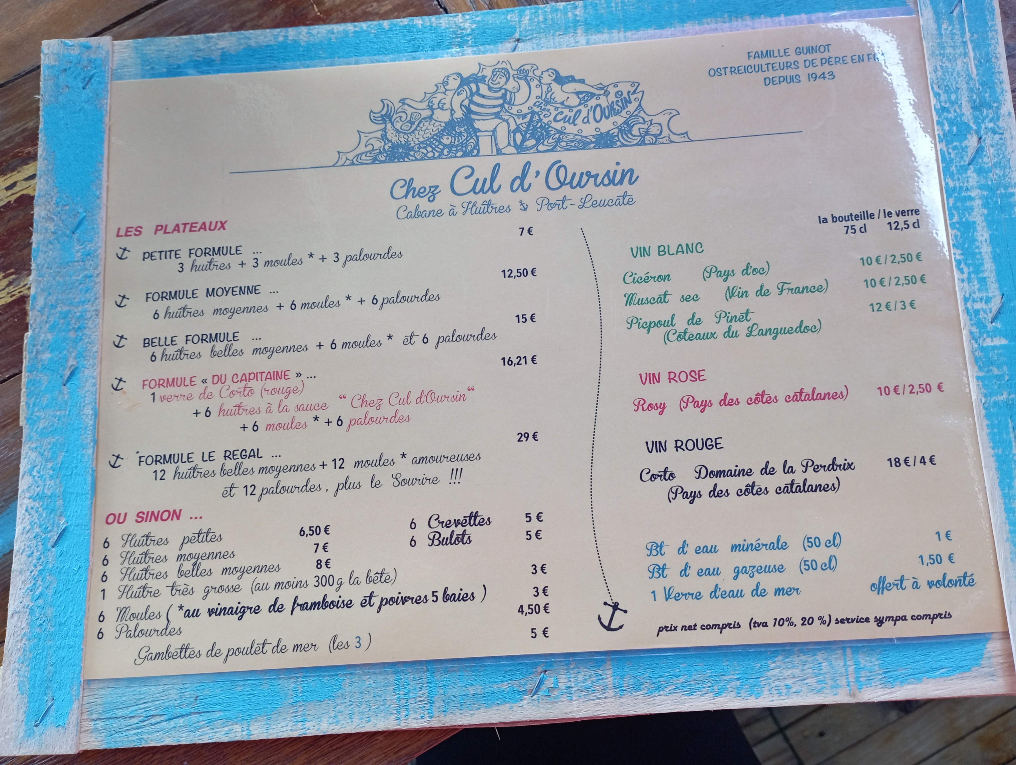 Nous sommes en vacances, cela fait 38 ans que je viens a port Leucate et plusieurs fois chez vous, aujourd'hui je suis chef de cuisine depuis quelques années et ayant fait les grandes maisons 3 étoiles au guide rouge, nous avons pris mon épouse et moi un plateau de fruits de mer et c'était top , qualité, fraîcheur et de très belles huîtres et pour me faire plaisir j'ai même repris 3 grosses huîtres 0 je me suis régalé. Alors c'est pour ça que je recommande chez cul d'oursin et croyez moi je reviendrai l'année prochaine. Merci a tous . Hervé chandioux