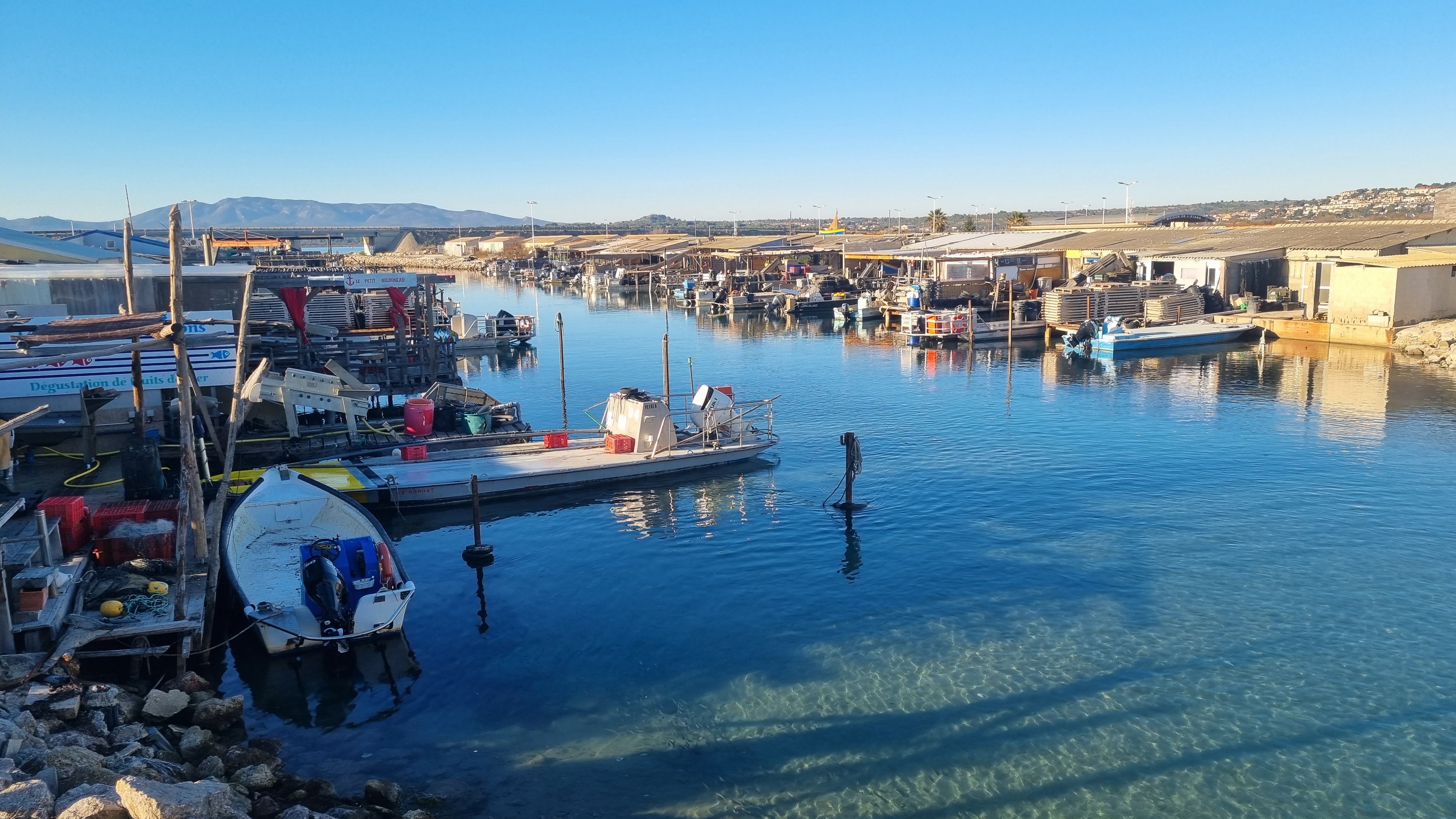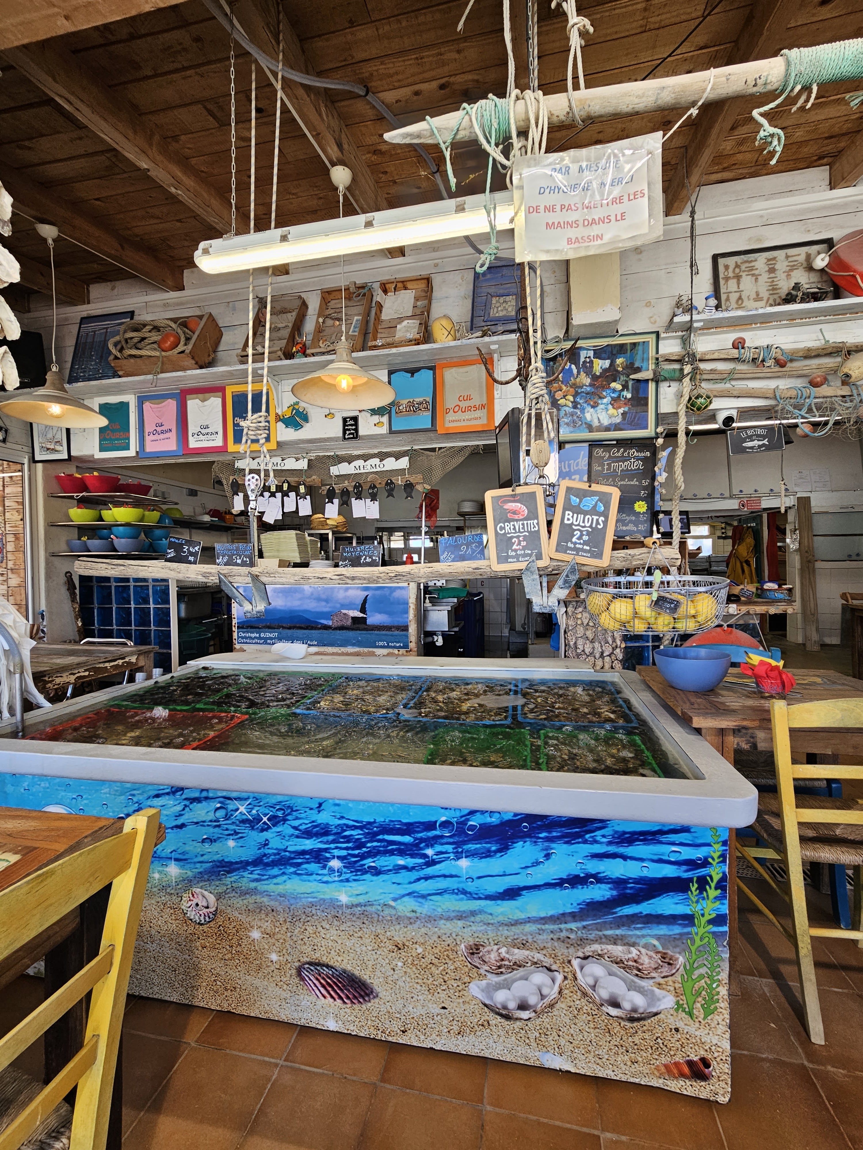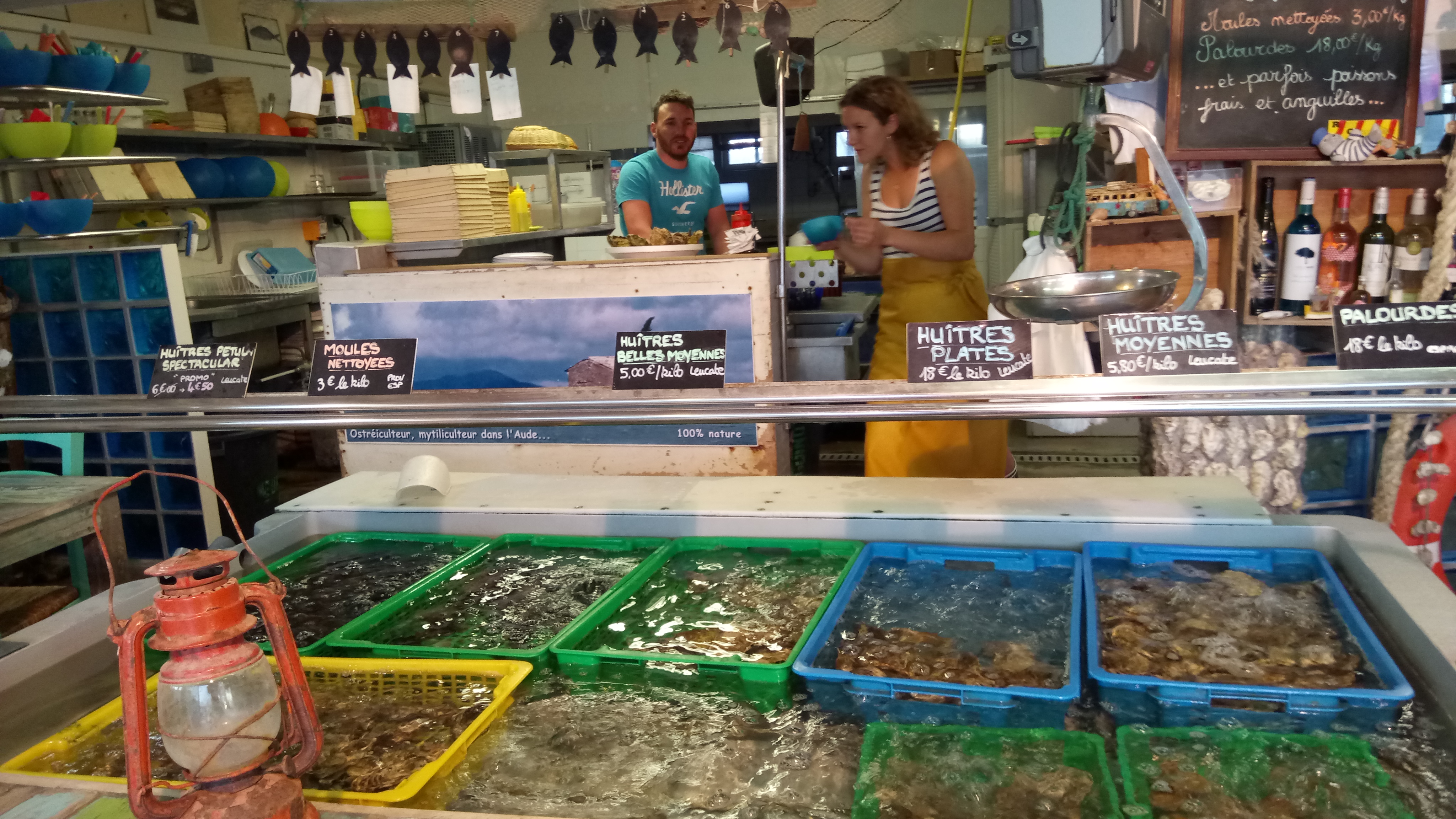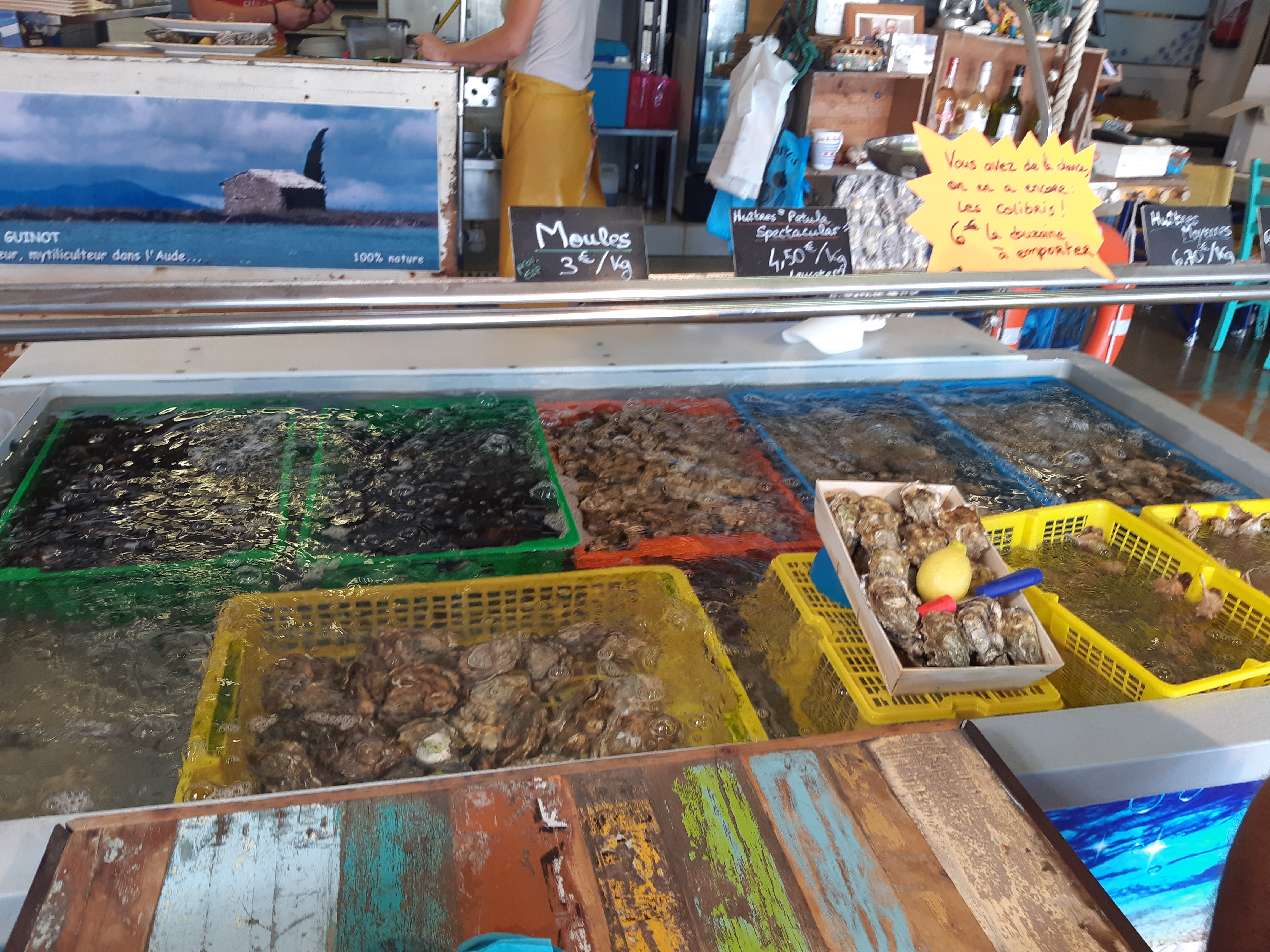 Toujours un plaisir d'aller chez Cul d'oursin, une authentique cabane à huîtres au centre conchiycole de Leucate, que ce soit pour déguster sur place moules, huîtres et autres coquillages avec un bon verre de blanc (local) ou pour acheter ces délicieuses moules prêtes à cuisiner.