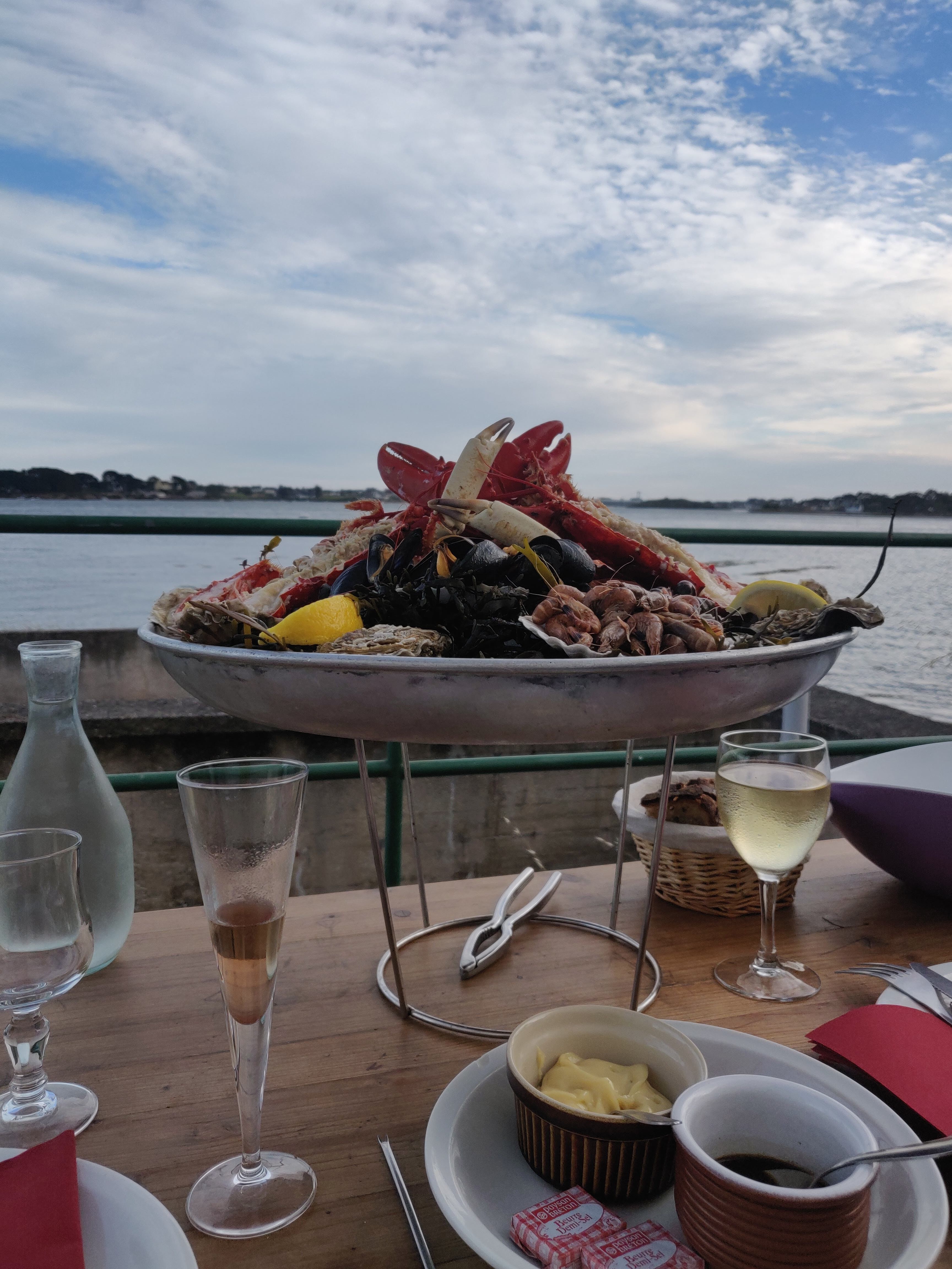 Incroyable plateau de fruits de mer avec des produits de qualités au bord de l'eau et vue sur l'île de Saint Cado ! Recommandé