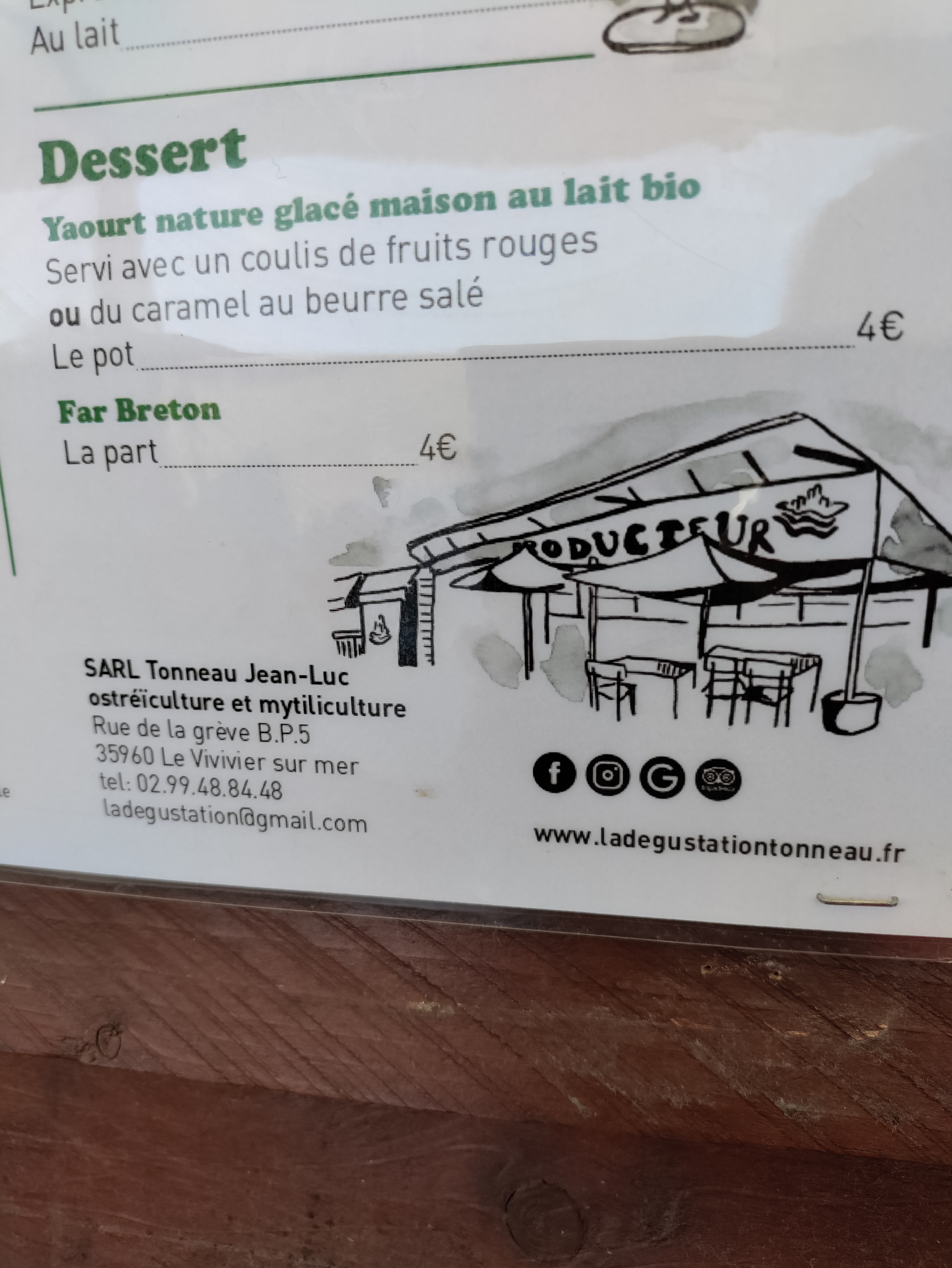 Honnêtement je recommande nous avons goûter les huîtres N4 excellent ensuite les moules marinières excellent et le far breton délicieux je recommande félicitations au cuisinier(e) C étais parfait Dommage que la deuxième fois on est eu des support en bois pour manger les huîtres pas très pratique et quand je pose la question on me répond pas pas très sympas or que le voisin d a côté avait des couvert normaux résultat de 5 étoile j en met 3