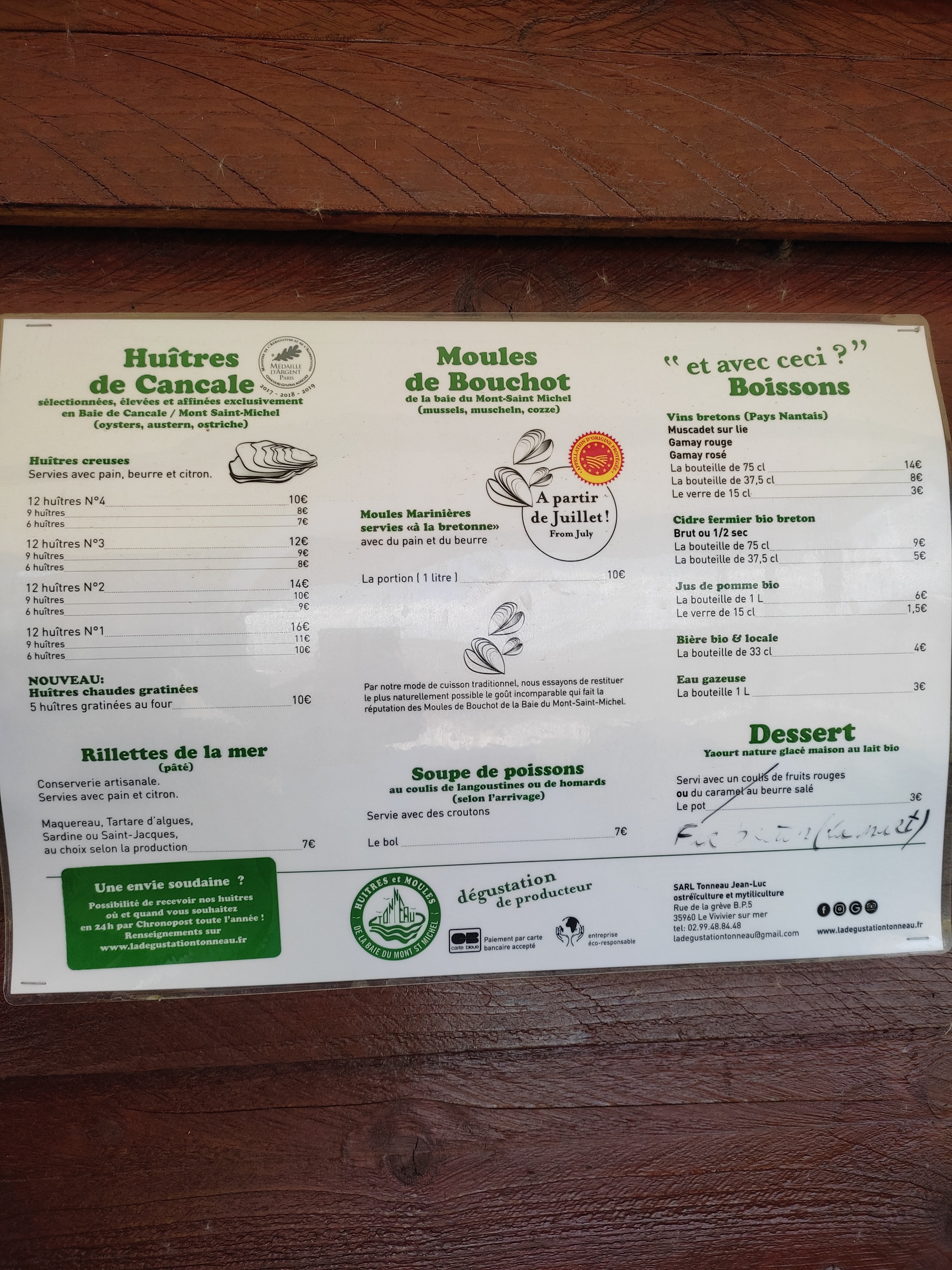 Excellent produits (huîtres et moules), service chaleureux, très belle vue sur la baie du Mont St Michel (l'endroit est privilégié car côté mer).