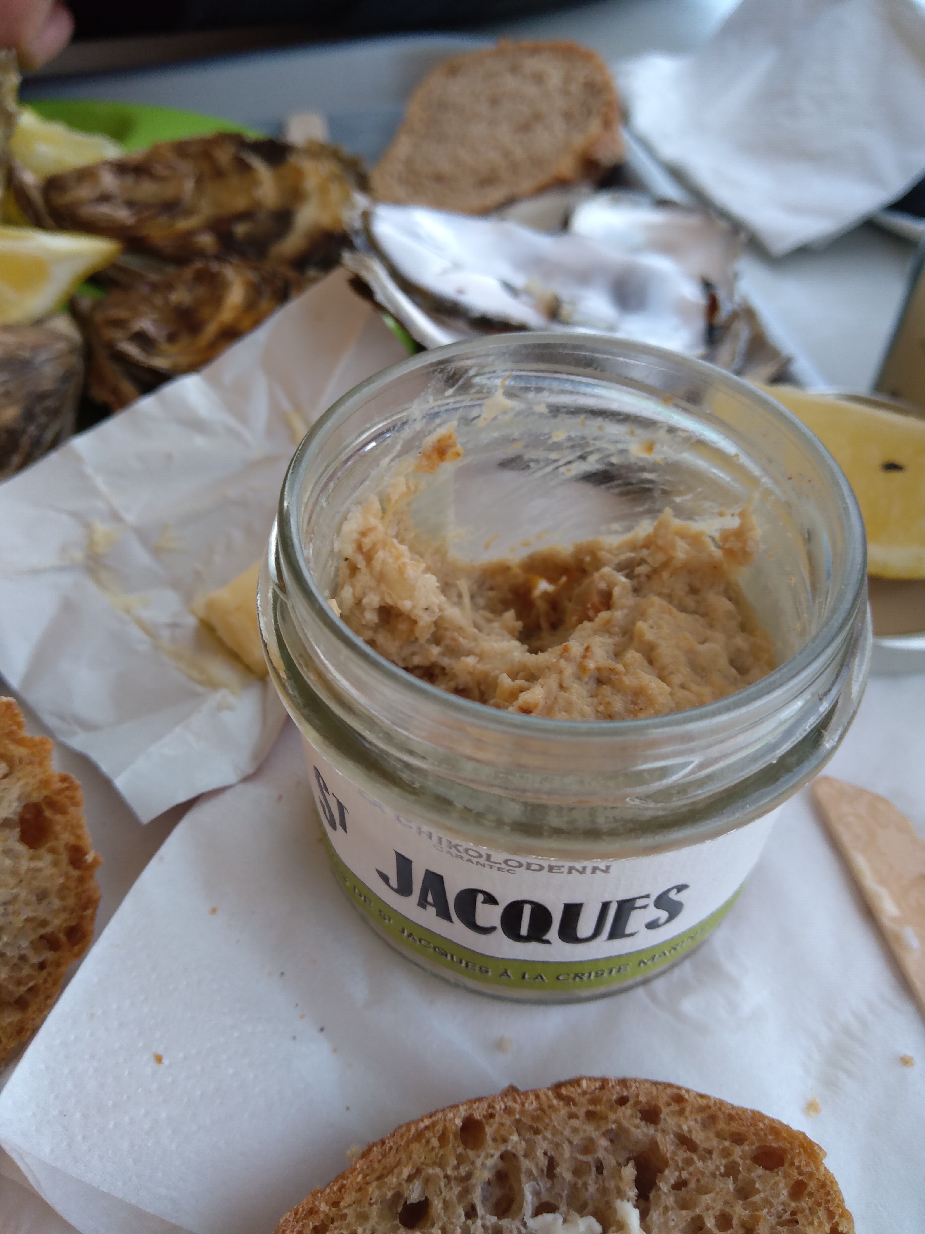 En apéro rillette à tartiner aux algues surprenant mais très bon, d'autre parfums possible sardine maquereau saint Jacques. Des huîtres crues et gratinées directes producteur. Le tout avec un cidre. On est revenu le lendemain midi avant de partir. On peut consommer sur place ou emporter. Attention aux horaires du soir fin mai c'était 19:00... Pas de moules avant début juillet elles ne sont pas prêtes.