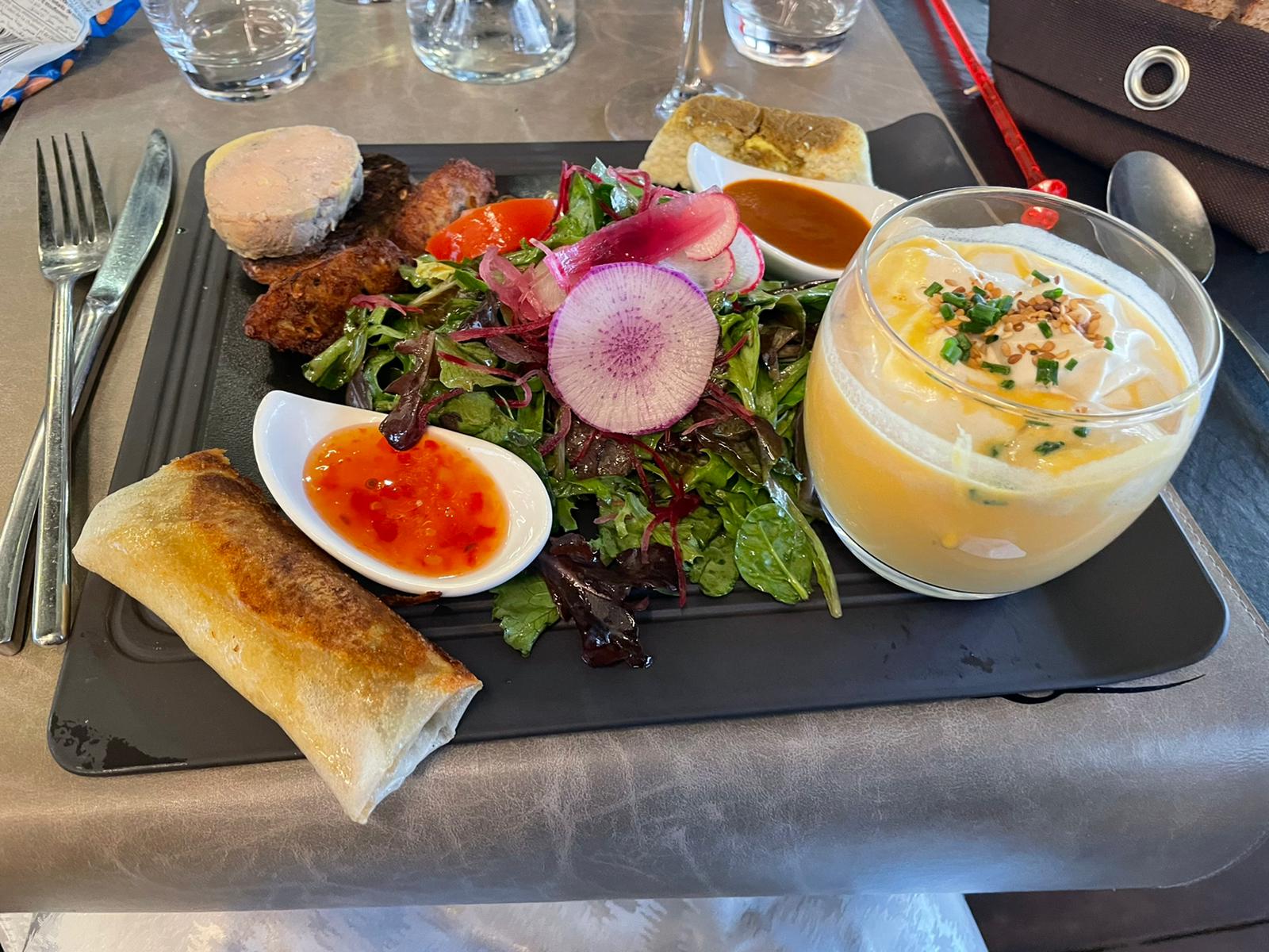 Foie gras au menu qui en fait est un « pâté de foie » de mauvaise qualité, je suis gersois donc, je reconnais un foie gras correct d’une produit industriel de mauvaise qualité ! Un magret de canard trop petit . Un verre de vin à 9 euros pièce ! Coquilles st Jacques (4) minuscules et qui sortaient du congélateur (quelconque) ! Un « écrasé de pomme de terre » sans saveur . Vraiment pas « terrible ».