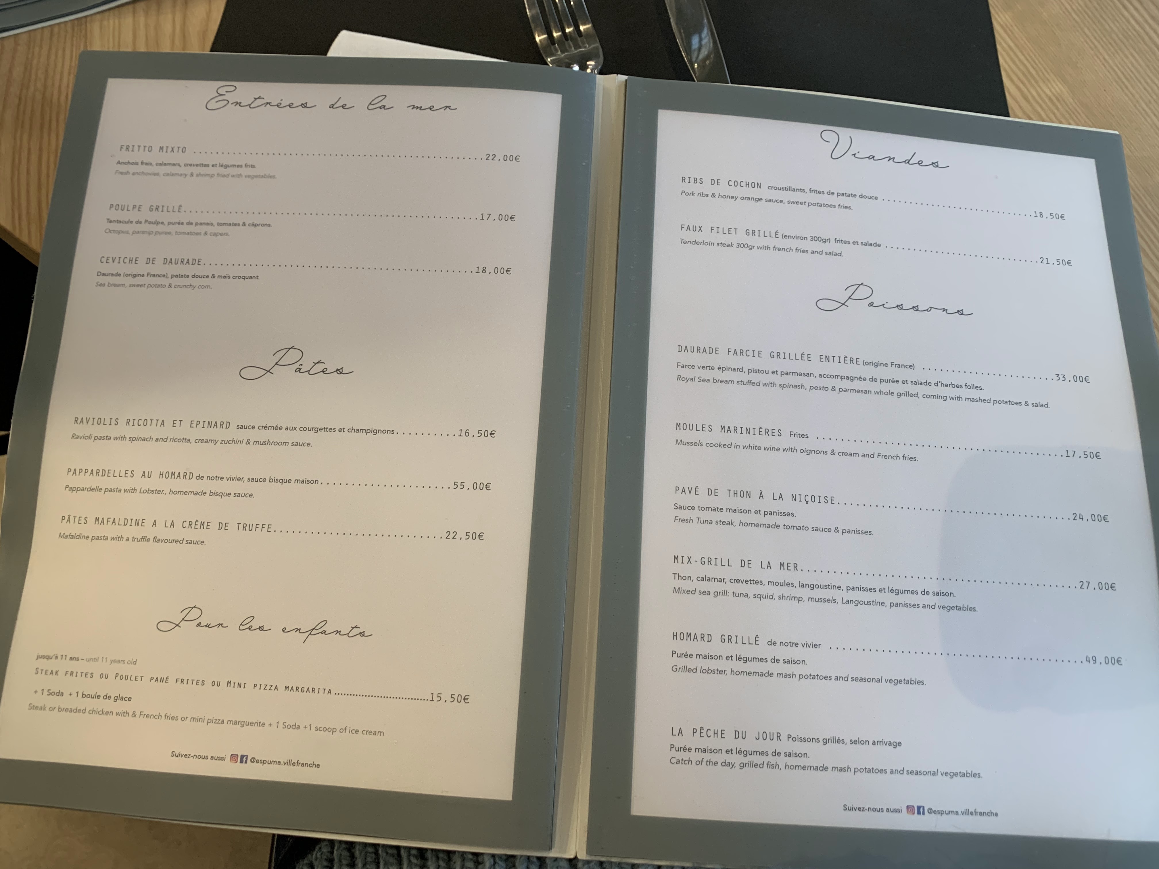 Très bon dîner de poisson. Excellent service. Une entrée crue et un mélange de frites accompagnés de deux plats principaux et d'une bouteille de vin blanc à un excellent prix pour la Côte d'Azur. Félicitations au lieu et à Victoria la serveuse qui s'est occupée de nous.