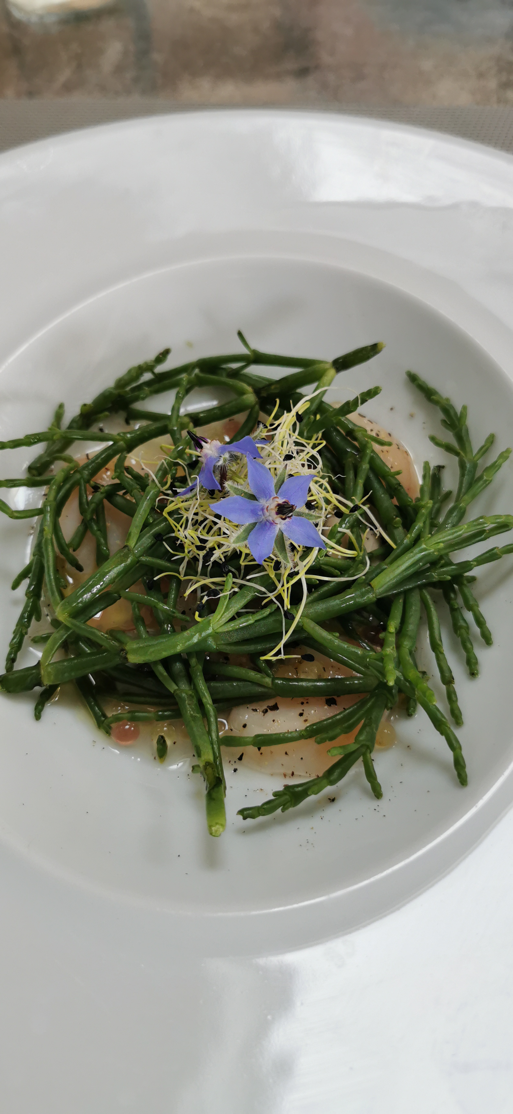 Nous sommes rentrées dans ce restaurant, avec mon amie d'enfance, par hasard. Nous n'étions pas pressées. Le repas un pur régal, notamment la salade huîtres, coquilles St Jacques, salicorne. Un lieu calme, tranquille et gentillesse de la propriétaire. Cela a contribué à une excellente journée. Nous reviendrons. Merci madame pour votre accueil et au chef de nous avoir régalé.