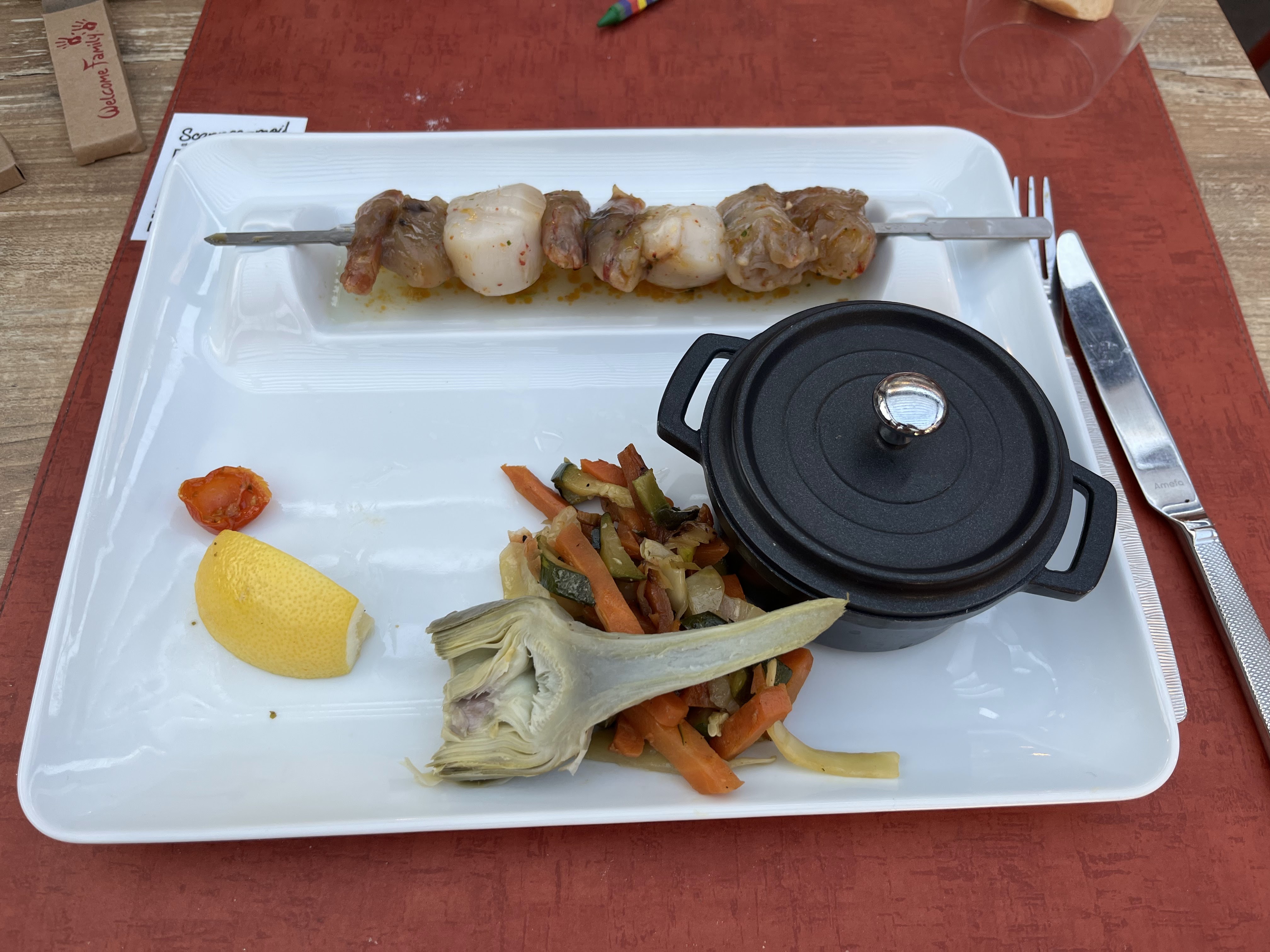Posté le 25/09/2021 à 23:31"Super restaurant. Ils offrent un petit kit de coloriage aux enfants au début ça c’est top. Ils nous ont offert une verrine au thon avec des toasts en apéro. Le menu est sur une tablette j’ai adoré l’idée ! Nous avons pris le plateau d’huîtres. Il y’a le choix dans le menu enfant (steak haché, poulet pané, moules, pâtes) mais il manque les frites !! Les enfants adorent les frites des dommage. Sinon nous avons pris la brochette de noix de saint Jacques gambas et le loup en poisson. Une tuerie !! Je recommande."
