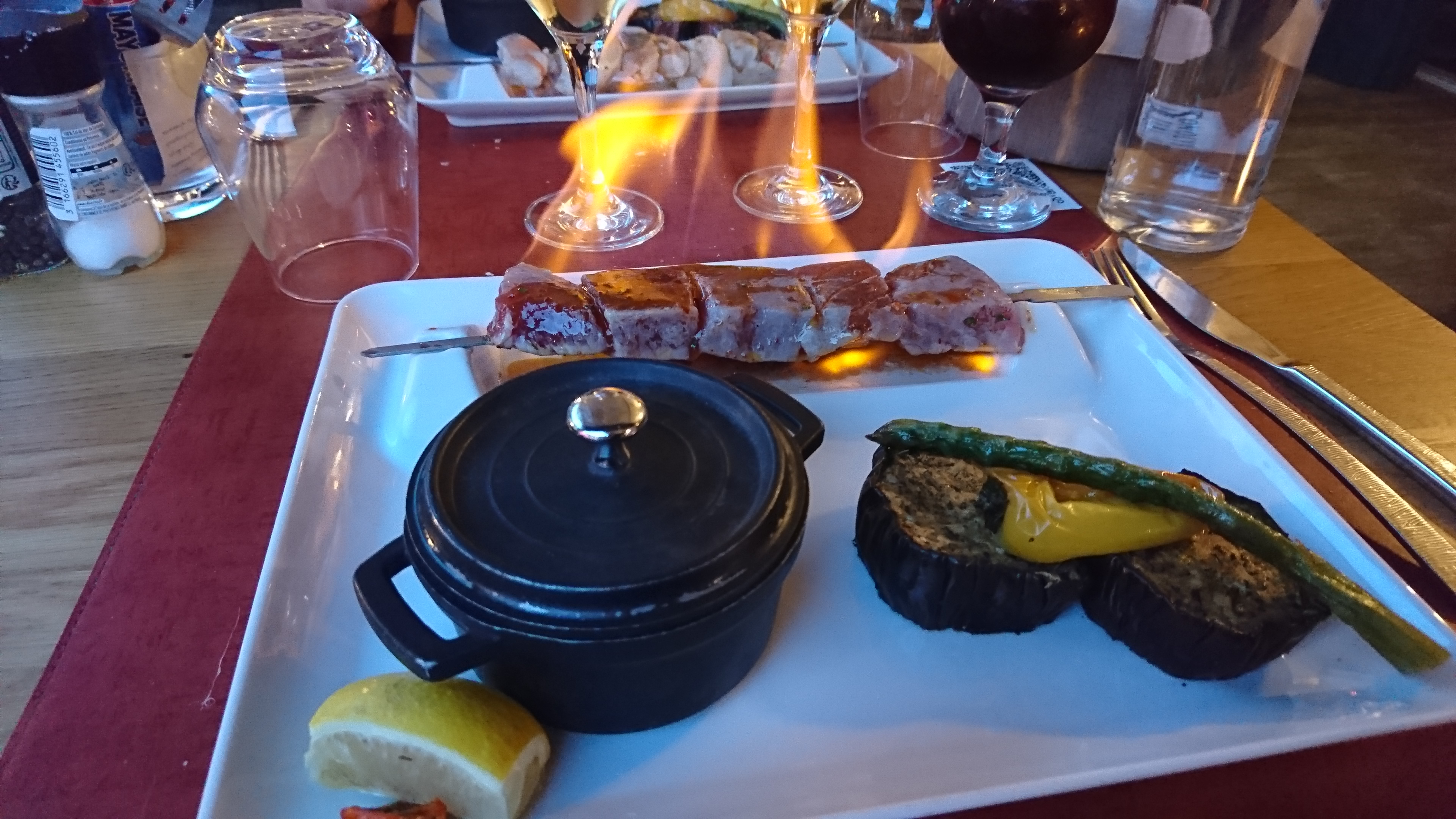 Nous sommes arrivé en retard le serveur nous a super bien accueilli et mis à l aise ainsi que le patron la nourriture est excellente et le cadre magnifique. mon compagnon a pris tataki de thon et risotto de St Jacques gambas et moi la brochette St Jacques gambas flamber devant vous c est magique😉.on reviendra
