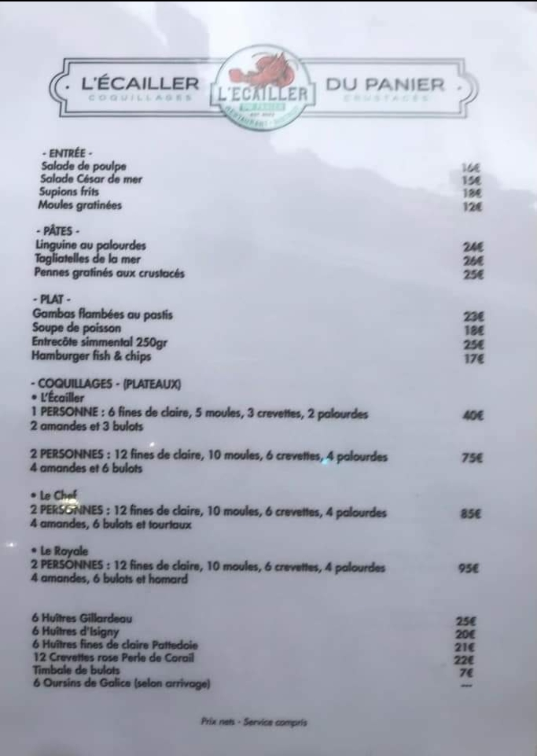 Posté le 26/12/2024 à 13:56"Bonjour tout le monde, super découverte... J'ai pour habitude de manger dans les restaurants de coquillages et de poisson . Nous avons pris du homard bleue ,huîtres de camargue , moule , linguine au poulpe, un vin blanc ,salade frites maison. Il y a eu zéro fausse note.... Nous avons passé un super moment de détente et regretté que ce moment de dégustation se finissent... J'ai hâte d'y retourner pour goûter la bouillabaisse et la bourride... Merci a toutes l'équipe de L'ecailler du Panier."