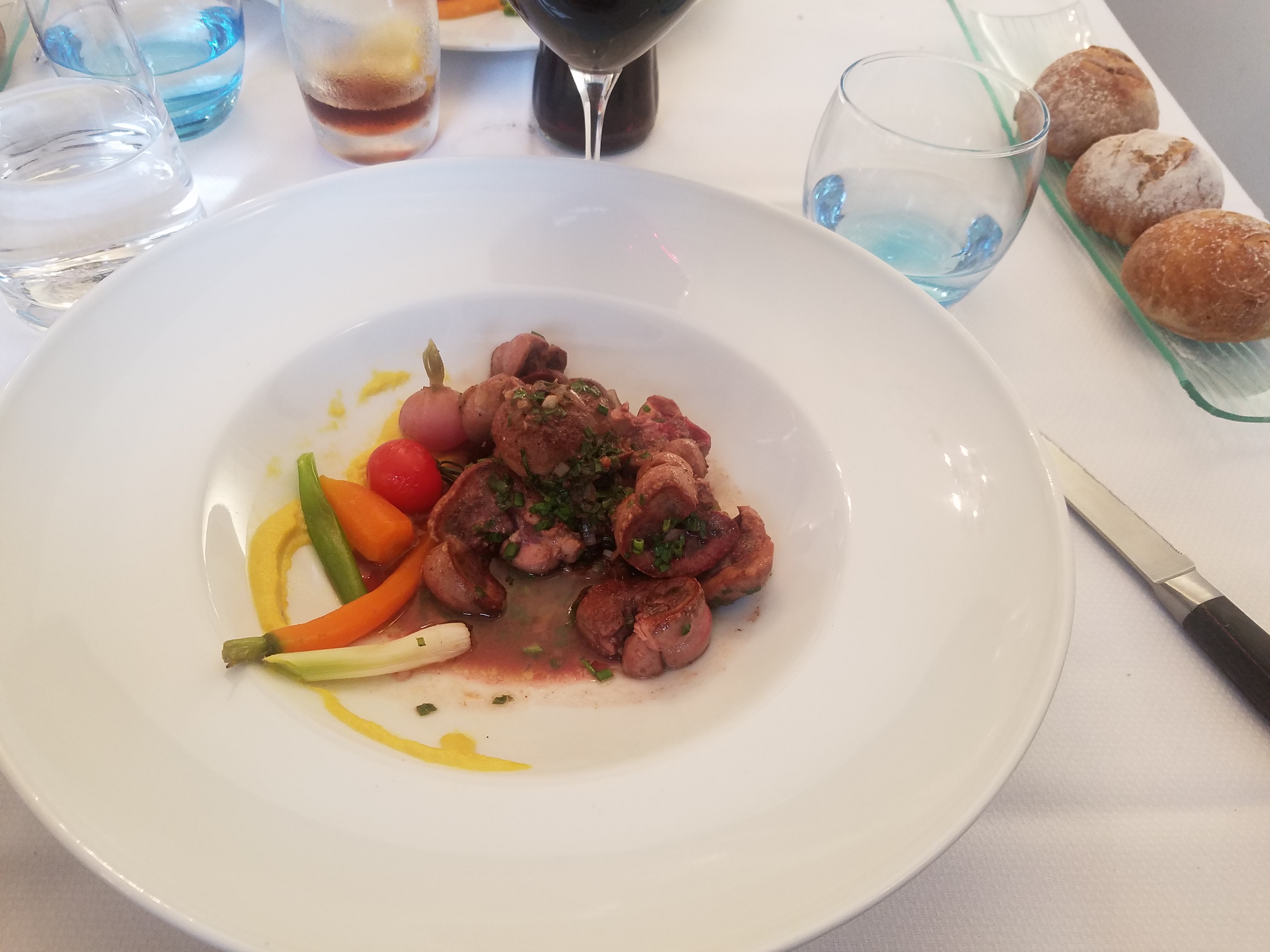 Posté le 11/02/2018 à 22:09"Cuisine raffinée mais le chef semble fâché avec les légumes. Deux radis, une pointe d'asperges et un bout d'une baby-carotte pour accompagner 200 gr de viande. En plus, il ne faut pas être pressé. 45 min d'attente avant que quelqu'un s'occupe de vous. Si vous venez habillé, comme le commun des mortels, on vous regarde légèrement de travers."