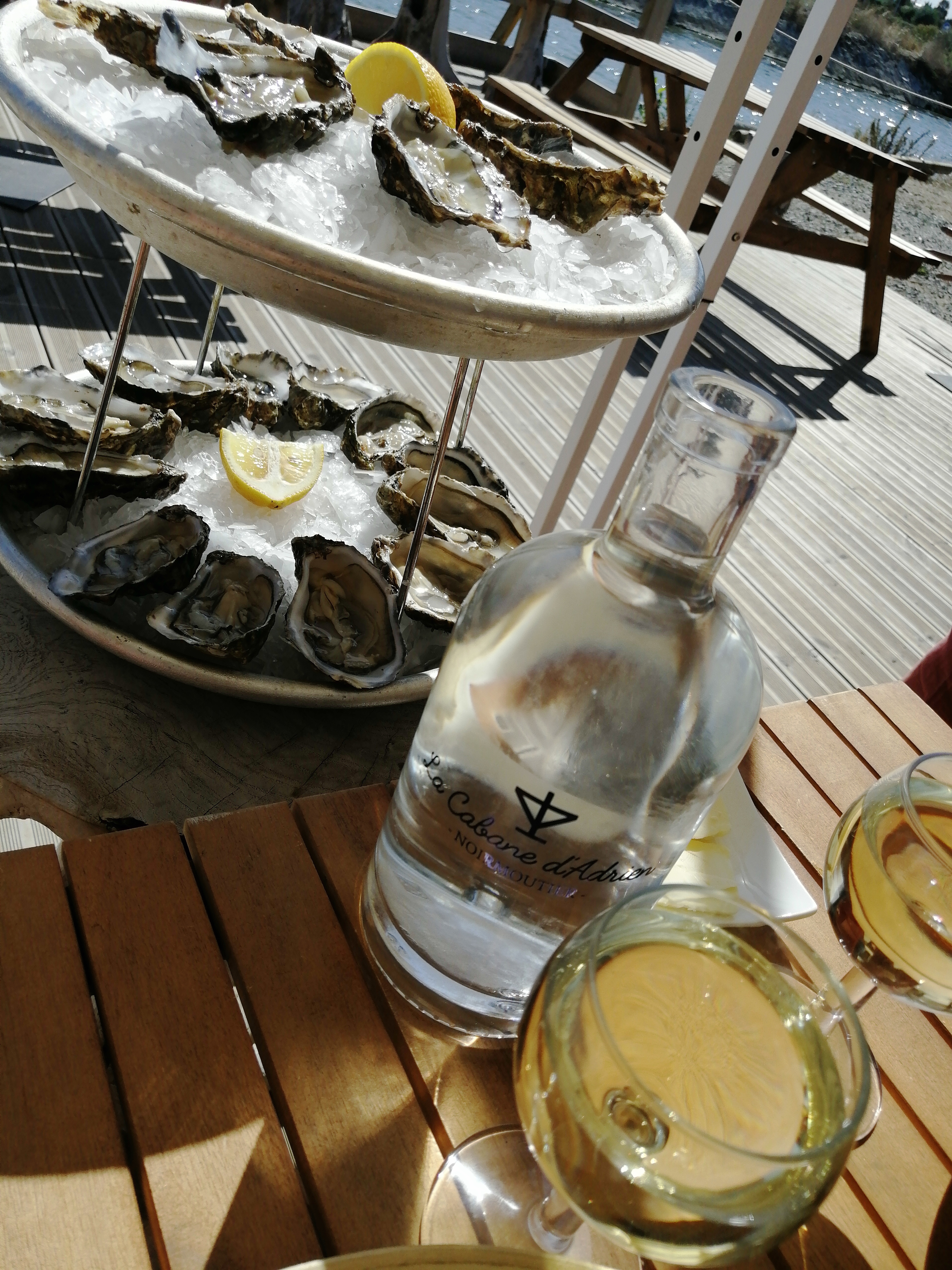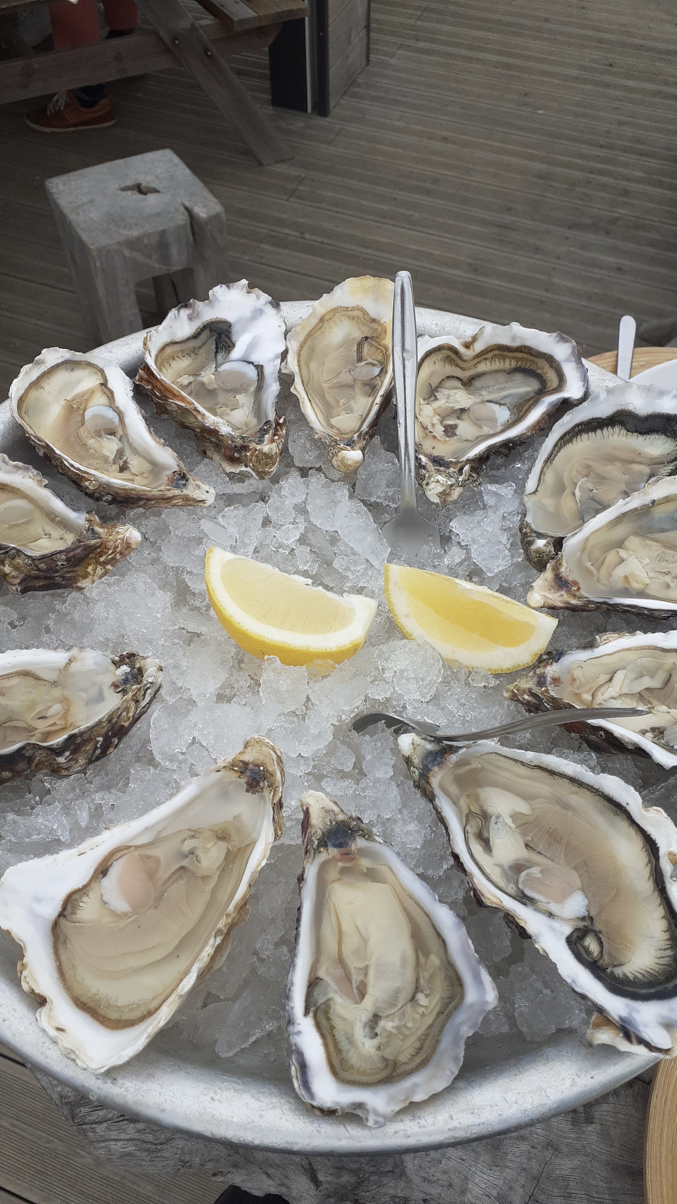 Lieu sympa pour une dégustation d'huîtres. Dommage pour nous, ce jour là une météo peu favorable, temps gris et frais mais enfin les serveuses ont l'habitude de distribuer des plaids! Un peu d'attente pour le dessert!