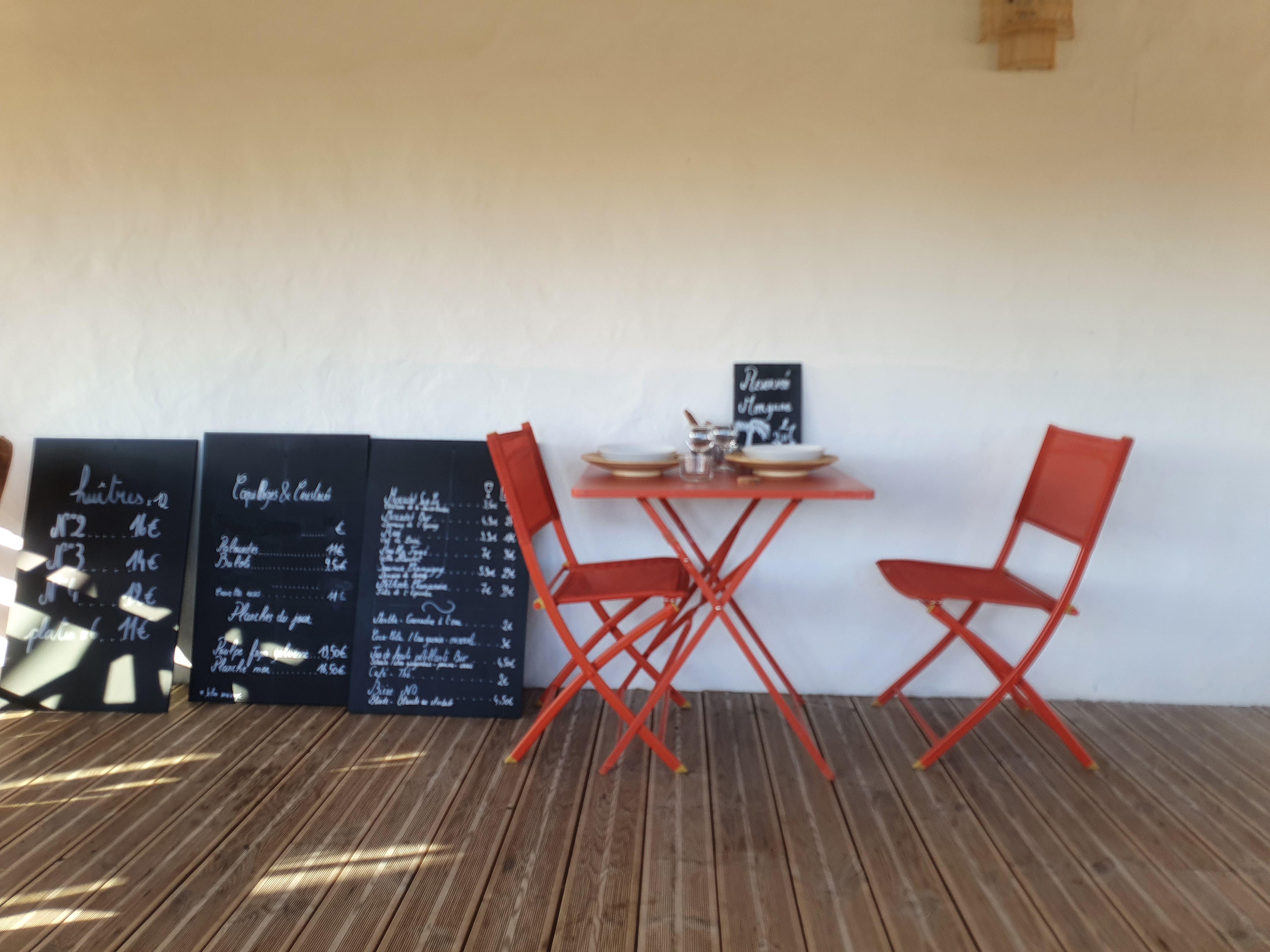 Tres déçu des tables et chaises pour deux personnes qui manquent de confort basique, table et chaises trop petite. Le service laisse aussi totalement à désirer, nous avons attendu plus d une demi heure entre les huîtres et l arrivée du plat. A ne pas conseiller du tout.