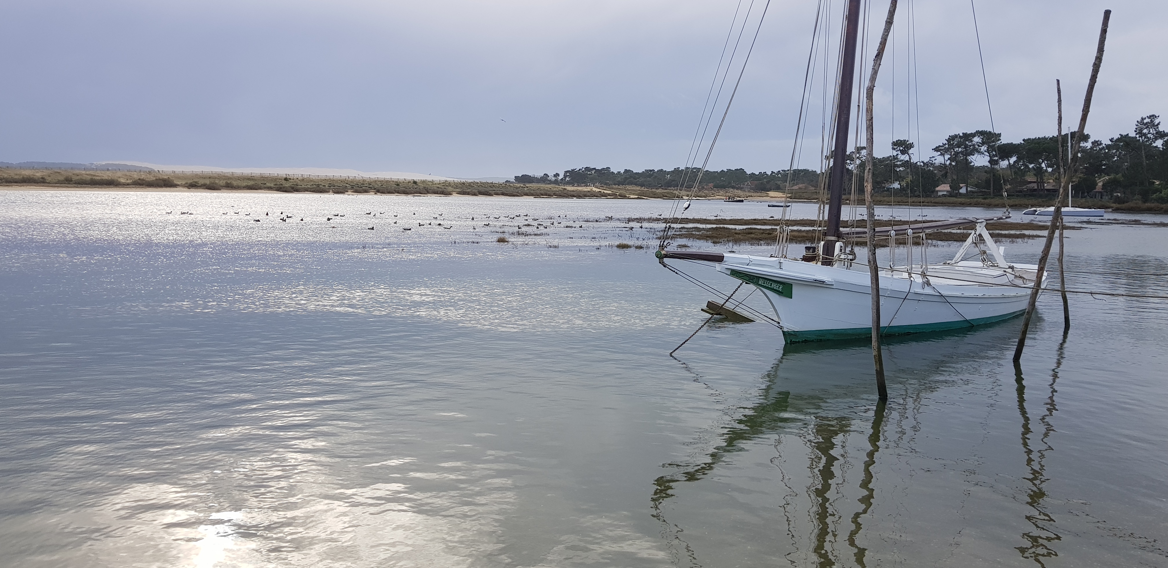 Nous avons déjeuné sur la terrasse des huîtres, du pâté basque et des crevettes (malheureusement pas du coin, mais en provenance se Madagascar), pour une soixantaine d’euros à 2 avec une bouteille de Pessac-Leognan blanc bien fraîche. Nous avons ensuite traversé un petit bras de mer, accessible à marée basse, directement en bas de la terrasse et qui nous a emmené sur une plage tranquille du bassin.