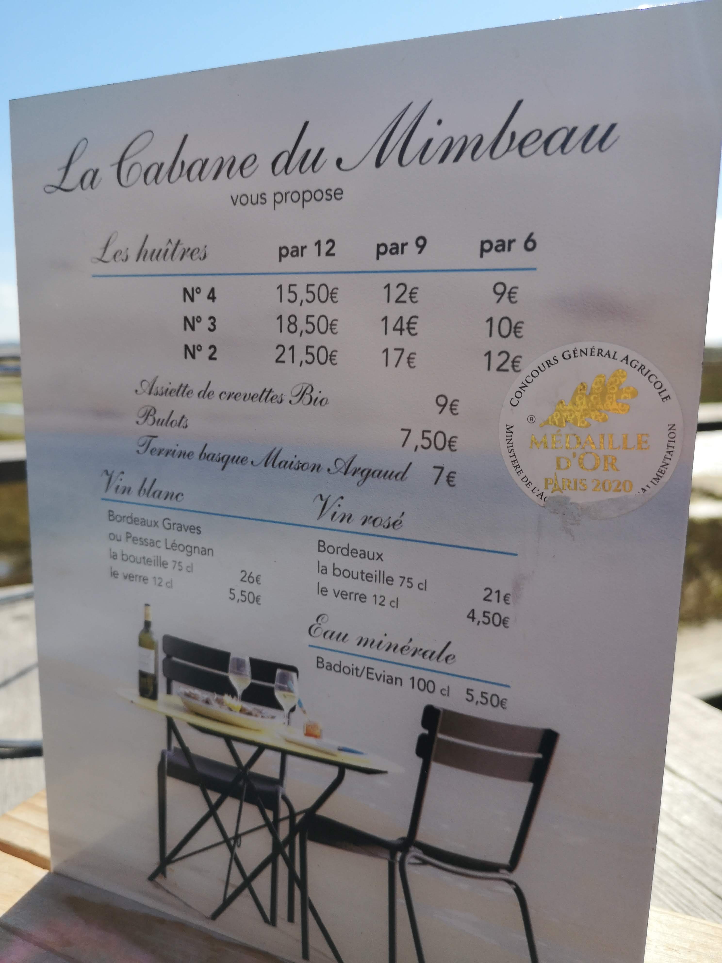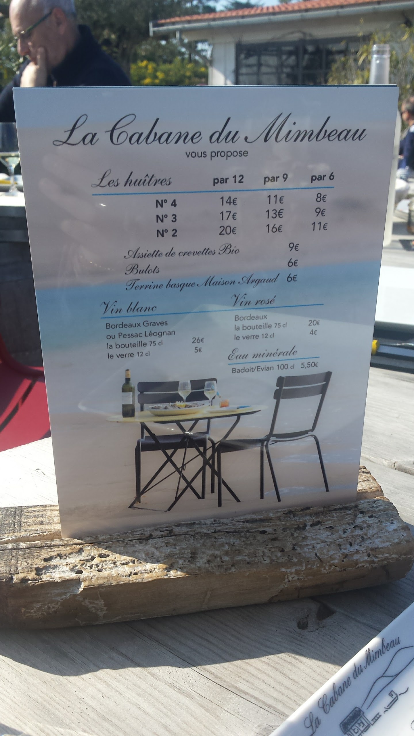 Nous nous sommes arrêtés à la cabane du Mimbeau en milieu d après midi. Nous y avons mangé un plateau d huitres. Très bonnes! L accueil et le service ont été parfait, il y avait peu de monde sûrement à cause de la canicule. Nous étions sur la terrasse et la nature autour offre un merveilleux spectacle. De plus nous avons assisté à la marée montante , qui a modifié le paysage en 30 minutes! Je recommande vivement si vous debpassage dans le coin !