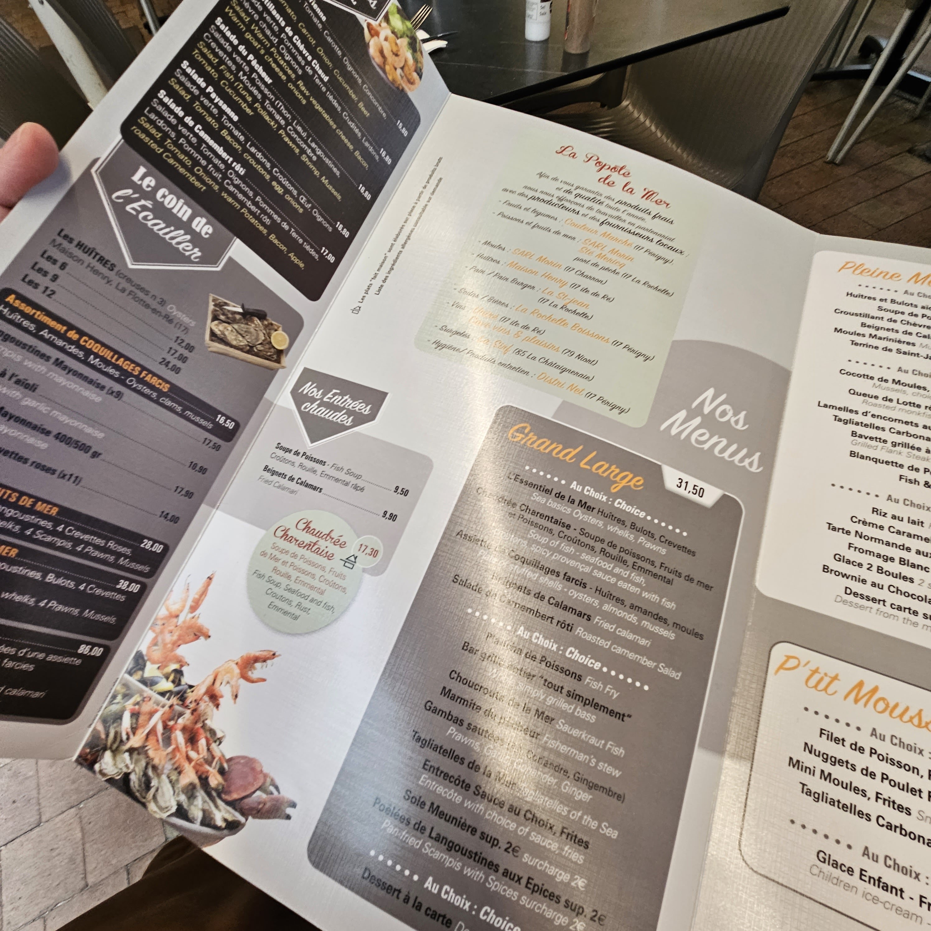 Le debit et la rapidité avant tout. A tel point que nos 2 assiettes sont arrivé a plus de 5 minutes d'écart. Pour la peine, le café de monsieur fut offert. J'avais pris un thé a la menthe....ils ont perdu la menthe...mais on ne m'a pas offert mon thé. Lol. Je vais rejoindre certains commentaires lus, une fois a table (on aurait du les lire avant....). Menu grand large a 27,40. Le large, pas sûr qu'il l'ont vu....C'est surtout de l'assemblage de produit industriel. Nous avons tenté de resté sur les spécialités, qui sont,du fait maison. La plancha....noyée sous les moules, le saumon et le bar trop cuit, les sardines decongelees et le tout....etait fade, pas assaisonné. La mamite du pêcheur, les cuissons bien, mais pas d'assaisonnement. Dommage.