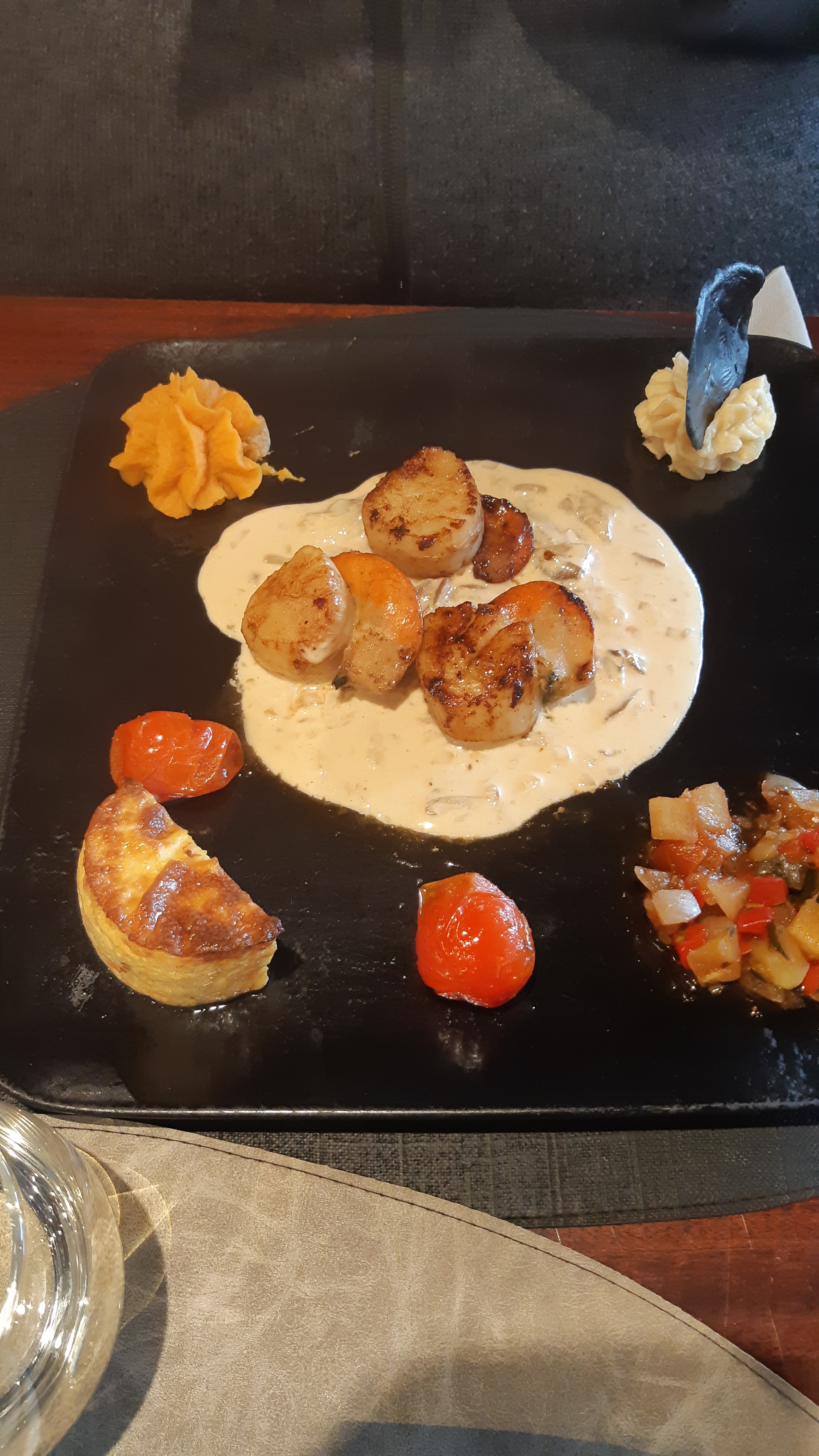 Posté le 02/11/2024 à 12:47"Repas en famille le 30 octobre Nous avons trouvé les coquilles Saint Jacques et leur accompagnement excellentes. Je recommande"