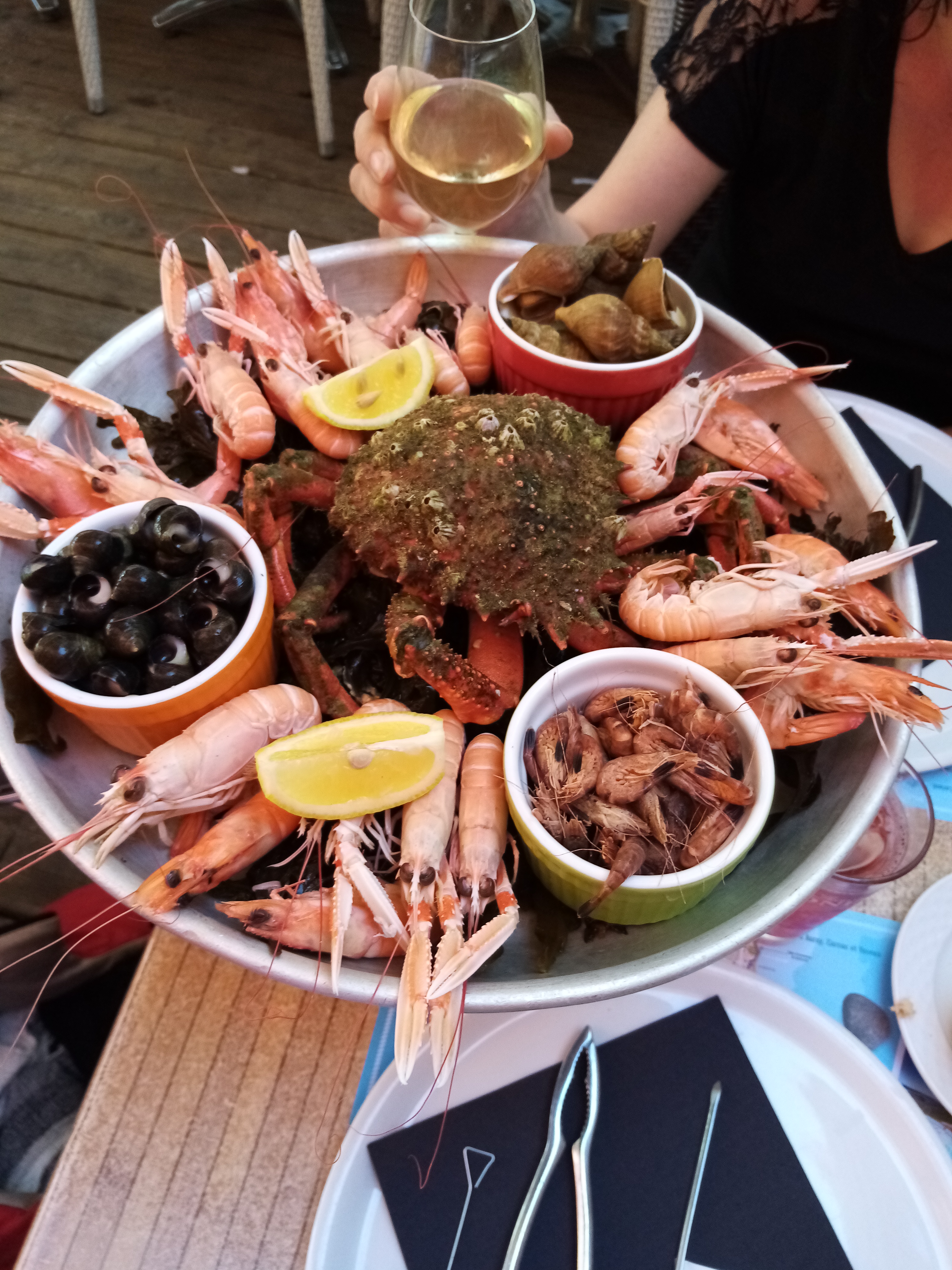 "On a pris la formule à 78€ : le double plateau de fruit de mer avec un apéro et une bouteille de vin, on s'est régalé même si c'est pas donné non plus, mais ce sont les prix du coin. On était pressés et le personnel a été super, ils nous ont servi très vite"