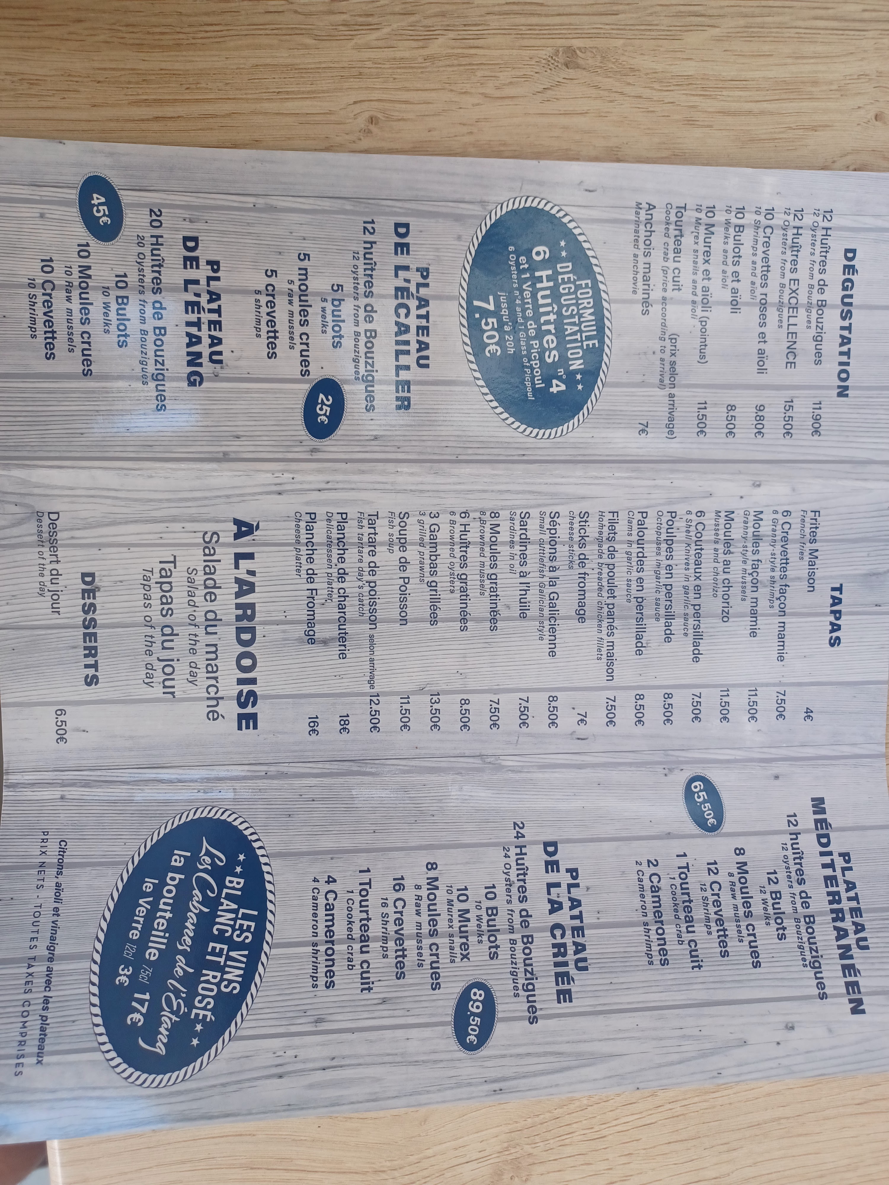 Je suis de l avis d un ancien client Le service est trop lent sans doute par manque de personnel Nous avons pris des tapas...poulpe,scipions, couteaux...et des frites mais tout étaient trop cuits Et les portions sont petites! Par contre les vins sont à un prix raisonnable ! C était la première et la dernière visite dans ce restaurant ! Nous avons trouvé mieux sur Portiragnes plage