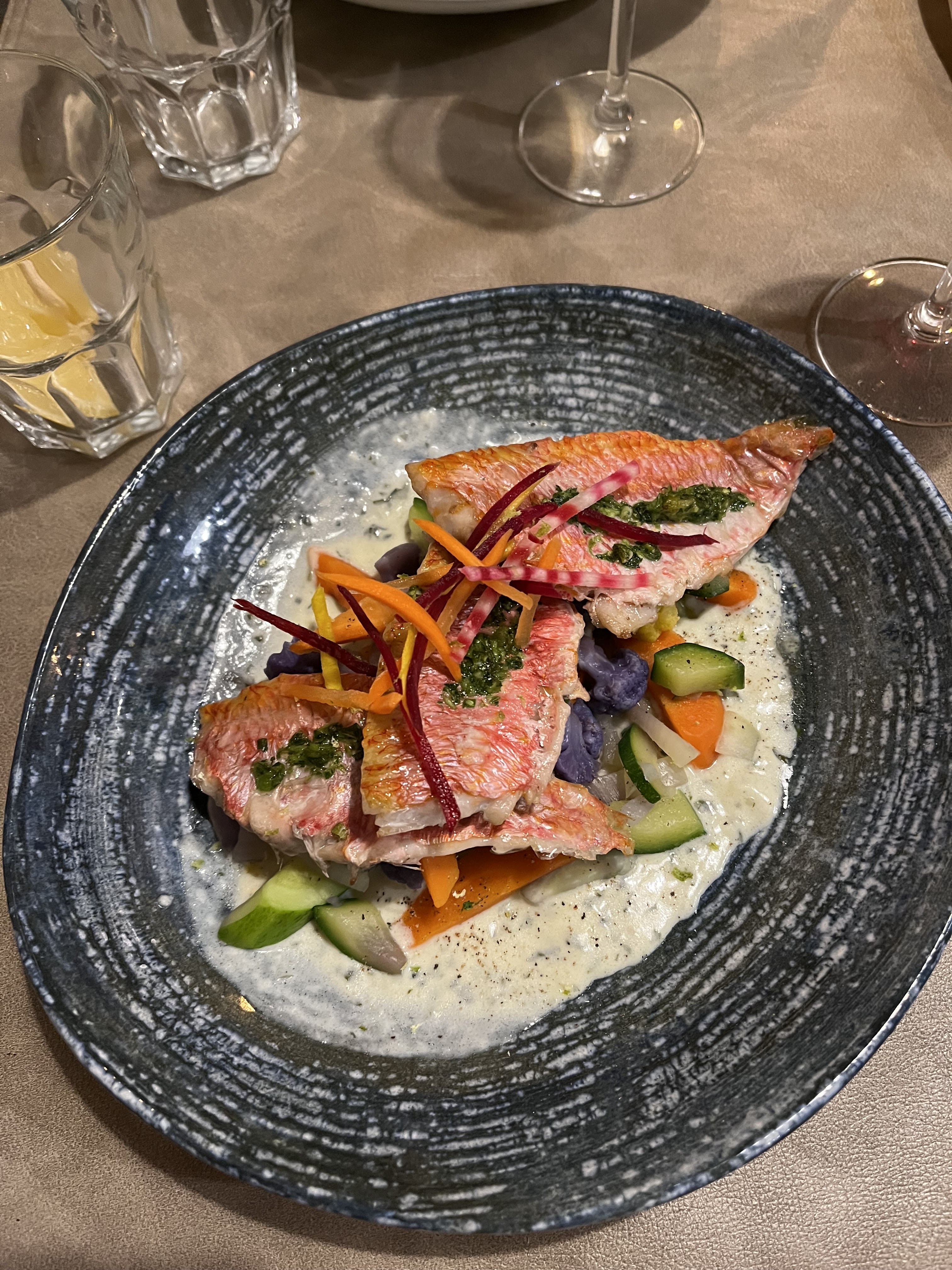 Posté le 25/10/2022 à 13:53"Cabillaud aux légumes du marché. Le cabillaud était parfaitement cuit et excellent. Dommage que les légumes étaient bien trop fades et ne semblait pas venir du marché mais du congélateur ! Je n’ai pas retrouvé le goût de la carotte. Car elle n’avait aucun goût, Les haricots et petits pois étaient surgelés, normal puisque ce n’est pas la saison, les pommes de terre, « grenailles » elles, semblaient venir du marché. L’aïoli était parfait. Le vin excellent. Prenez le temps d’éplucher les légumes et de les assaisonner, cela améliorera considérablement ce plat qui était au demeurant très bien présente."