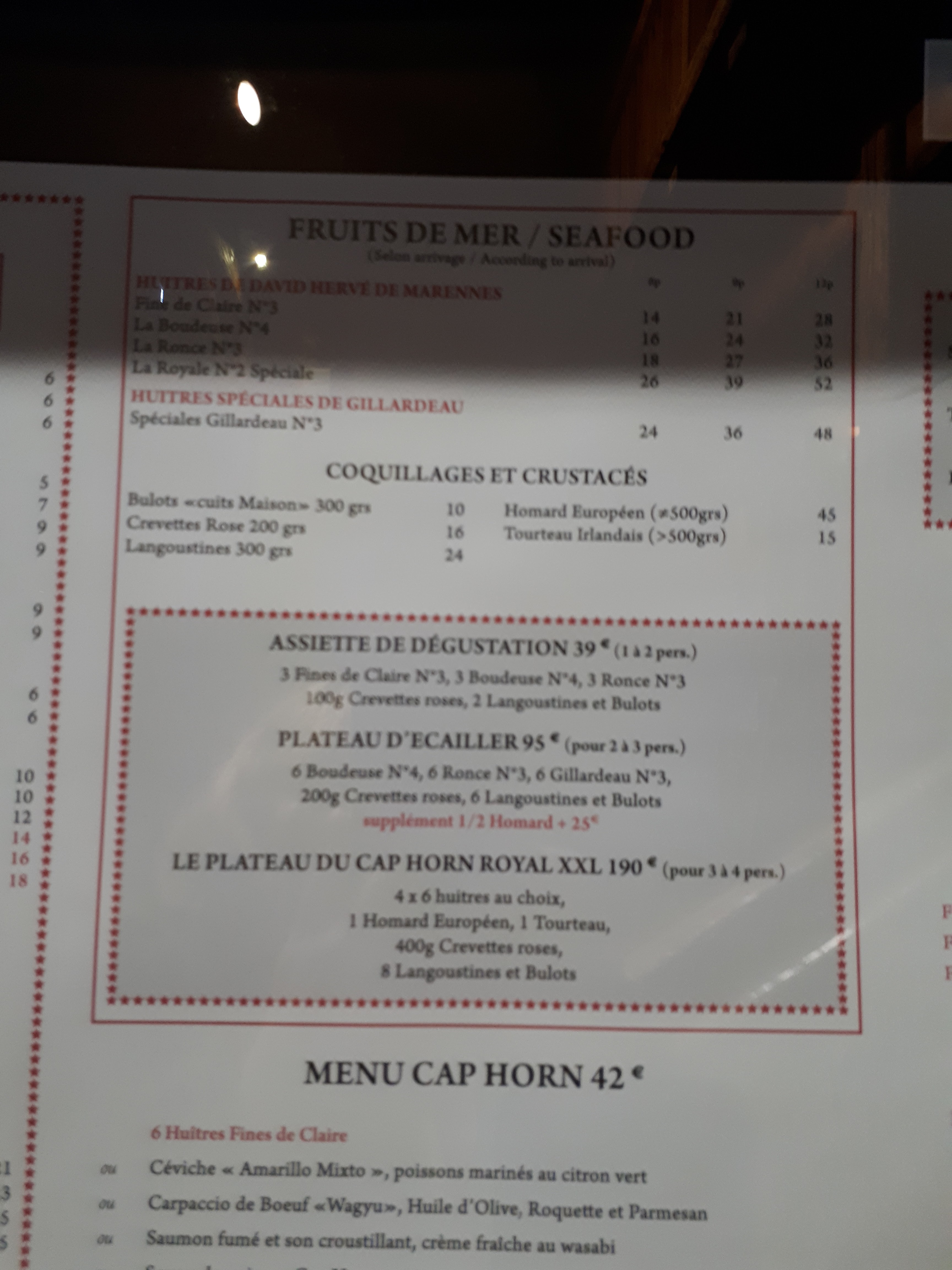Bonne soirée au Cap Horn mais nous avons dû demander deux fois notre bouteille de vin et quatre fois un verre de vin alors que les plats sont arrivés très vite. Un peu bruyant à cause d'un groupe à proximité de notre table.