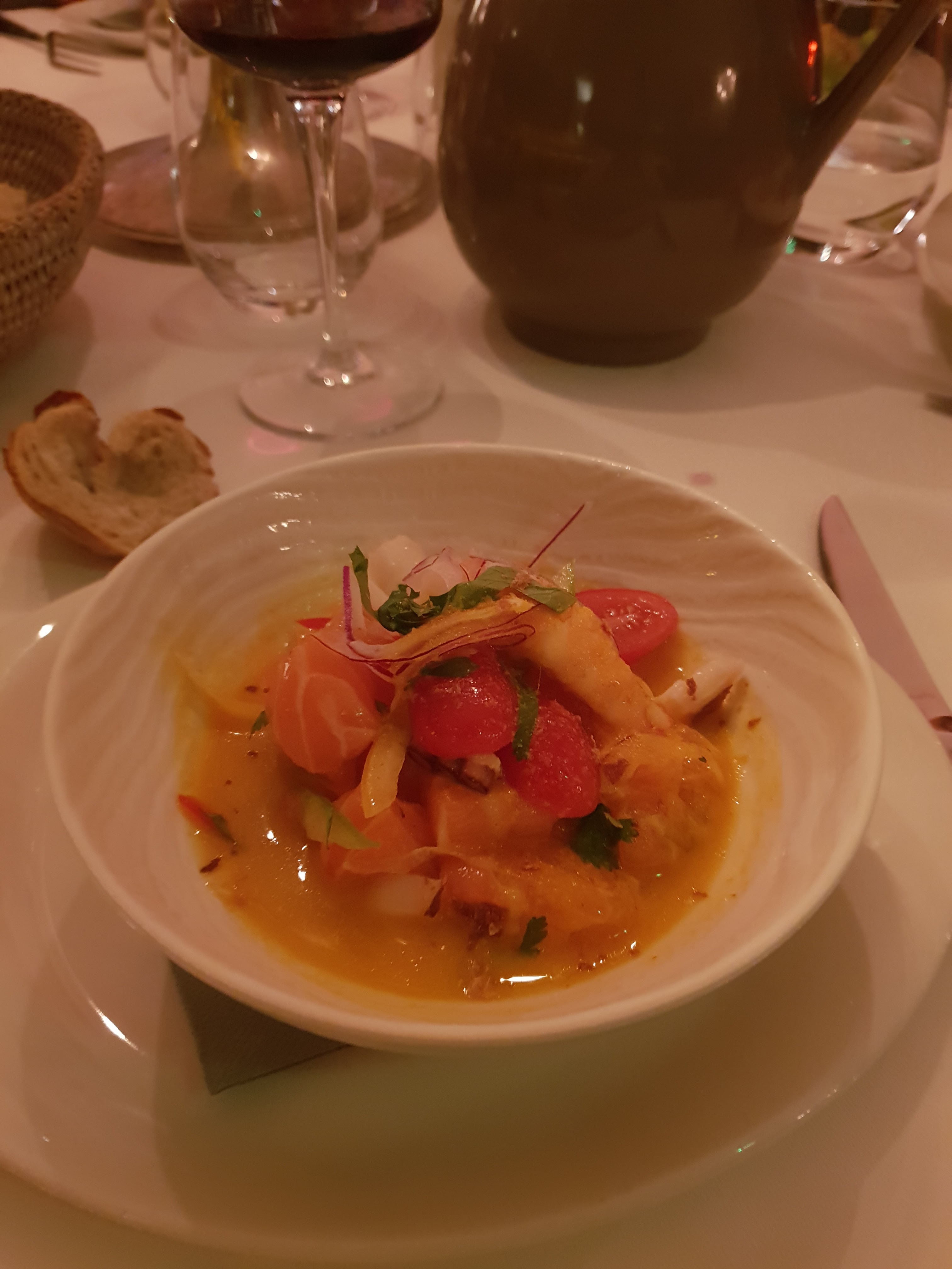 Le restaurant étant grand (500 couverts) vous n'entendez pas la conversation des autres clients. Les tables sont recouvertes de nappe en tissu et de serviette aussi en tissu. La vue, le personnel est très agréable. Nous avons pris le menu à 42€, excellent !! J'en ai oublié de prendre les photos des plats principaux !! A refaire
