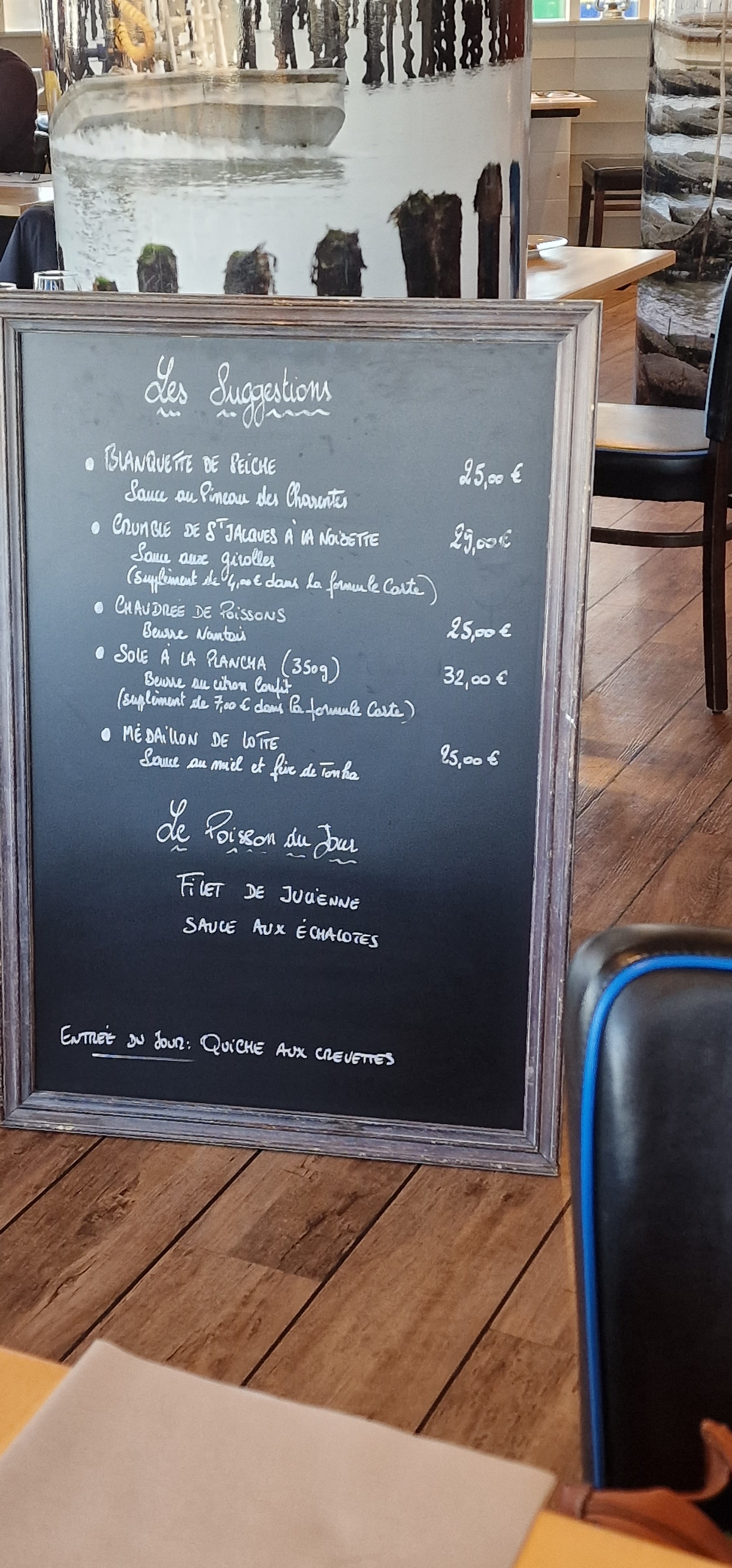 Posté le 15/10/2024 à 20:35"Excellent restaurant, le poisson est frais et l'emplacement à côté du port de pêche est parfait... Le seul inconvénient et l'attente à midi, il y a beaucoup de monde alors les serveuses sont dépassées... Quand il y a du monde c'est un peu trop bruyant, pour vos repas en amoureux choisissez plutôt le soir... La formule du midi est excellente, pour 20,90€ vous avez l'entrée, le plat et le dessert du jour 👍. Le soir on a mangé à la carte, il faut compter 40€ par personne environ, ça fait un peu cher mais la qualité est au rdv... Sincèrement je recommande, c'est une très bonne adresse pour ceux qui aiment le poisson et les fruits de mer. ♥️♥️♥️"